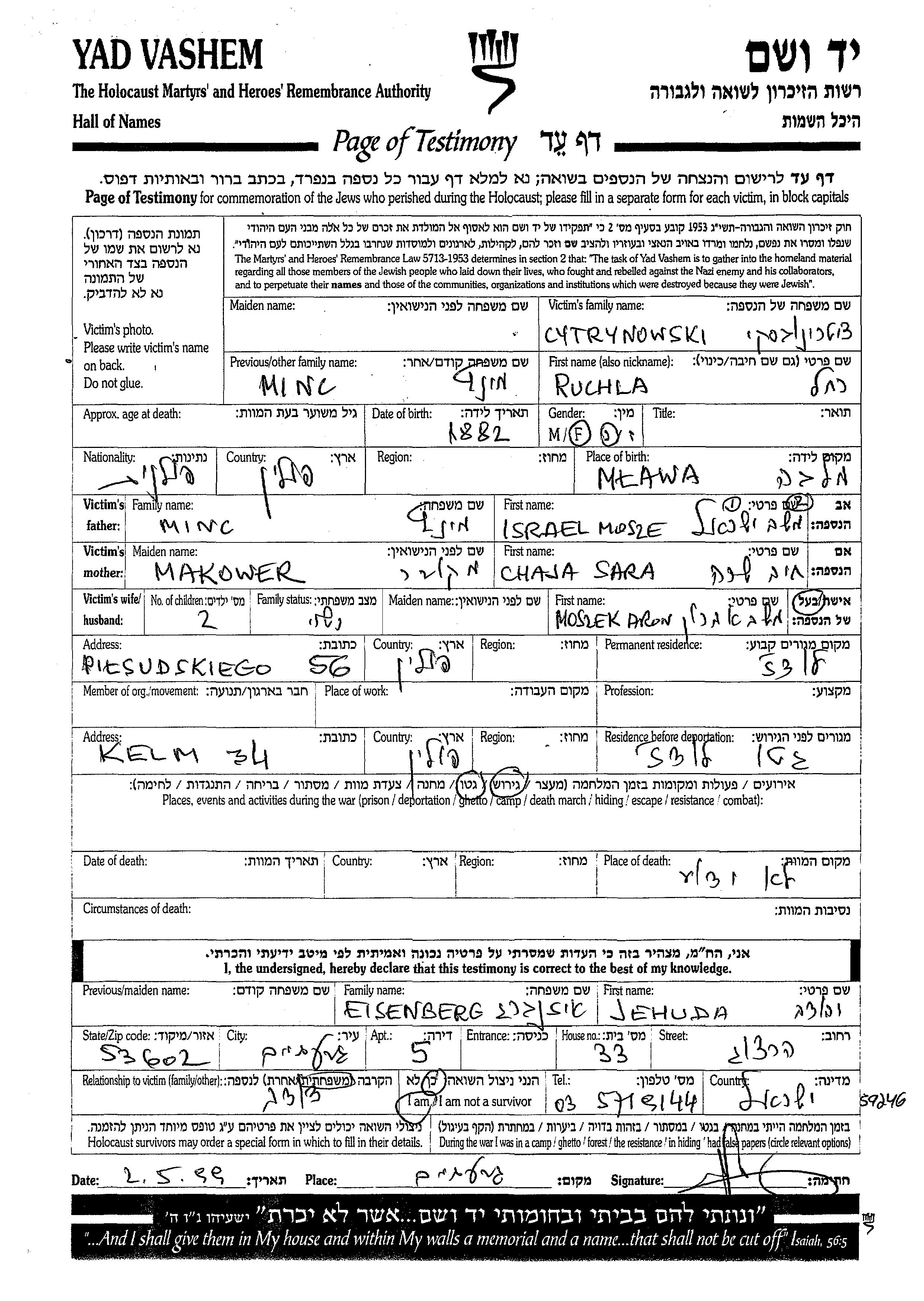 Ruchla Cytrynowski née Minc est née à Mlawa, Pologne en 1882, fille de Israel Mosze et de Chaja Sara. Elle était Mariée à Moszek Aron. Avant la seconde guerre mondiale elle vivait à Lodz, Pologne. Pendant la guerre, elle était à Lodz, Pologne.