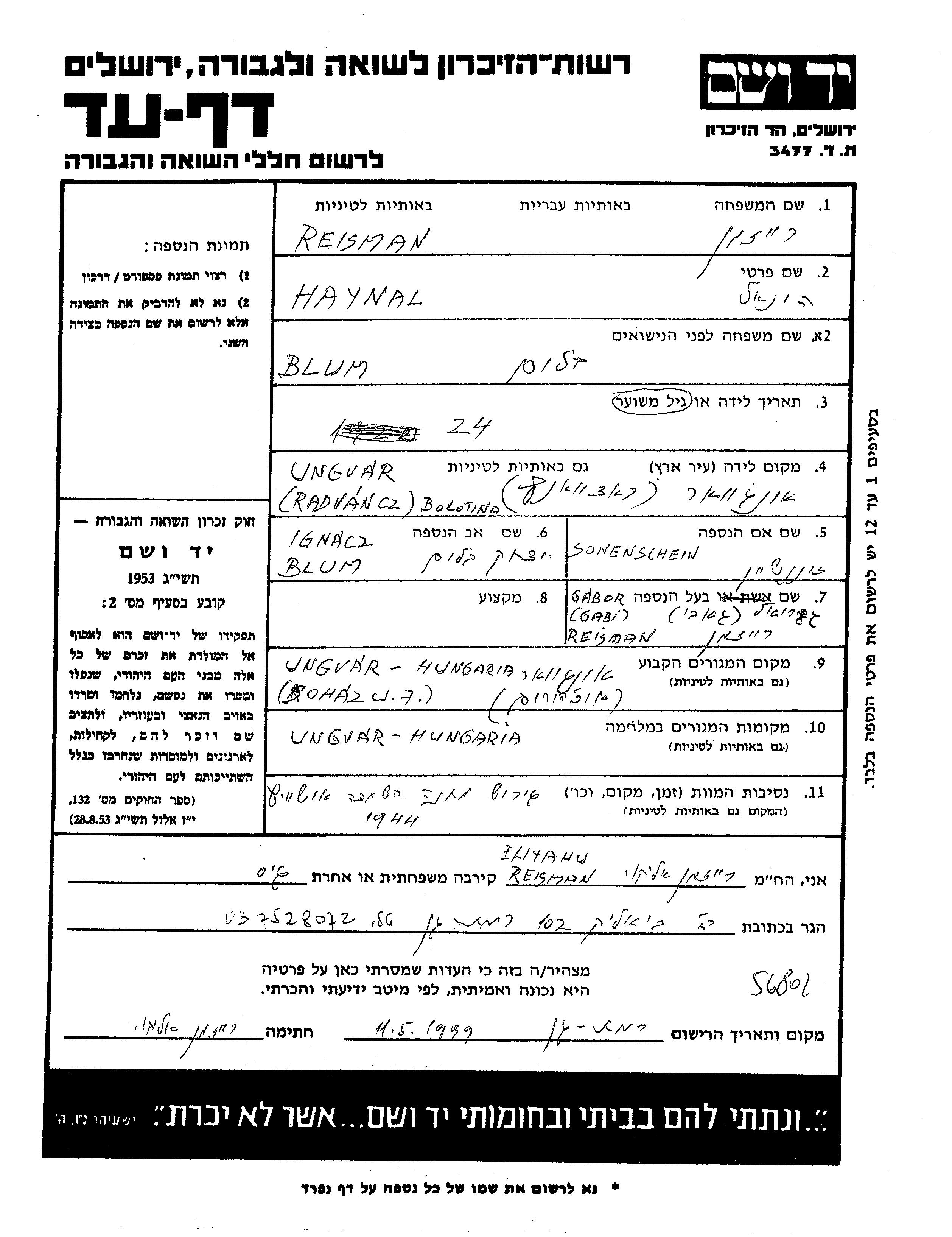 Haynal Hinal Reisman née Blum est née à Radvancz, Tchécoslovaquie, fille de Ignacz Yitzkhak. Elle était Mariée à Gabi. Avant la seconde guerre mondiale elle vivait à Radvancz, Tchécoslovaquie. Pendant la guerre, elle était à Ungvar, Tchécoslovaquie.