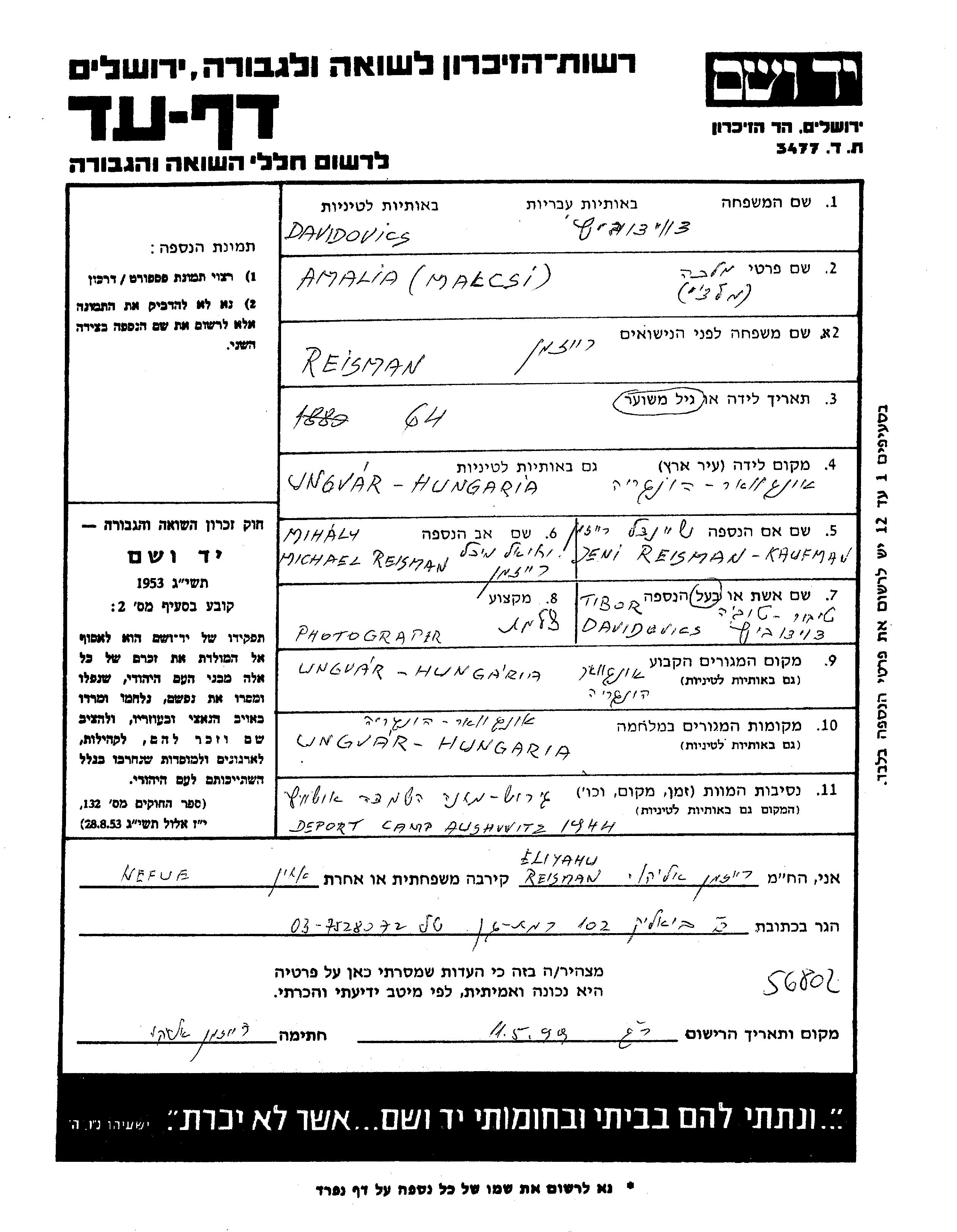 Davidovics Malcsi Amalia 1880 Ungvar, Tchécoslovaquie Feuille de témoignage