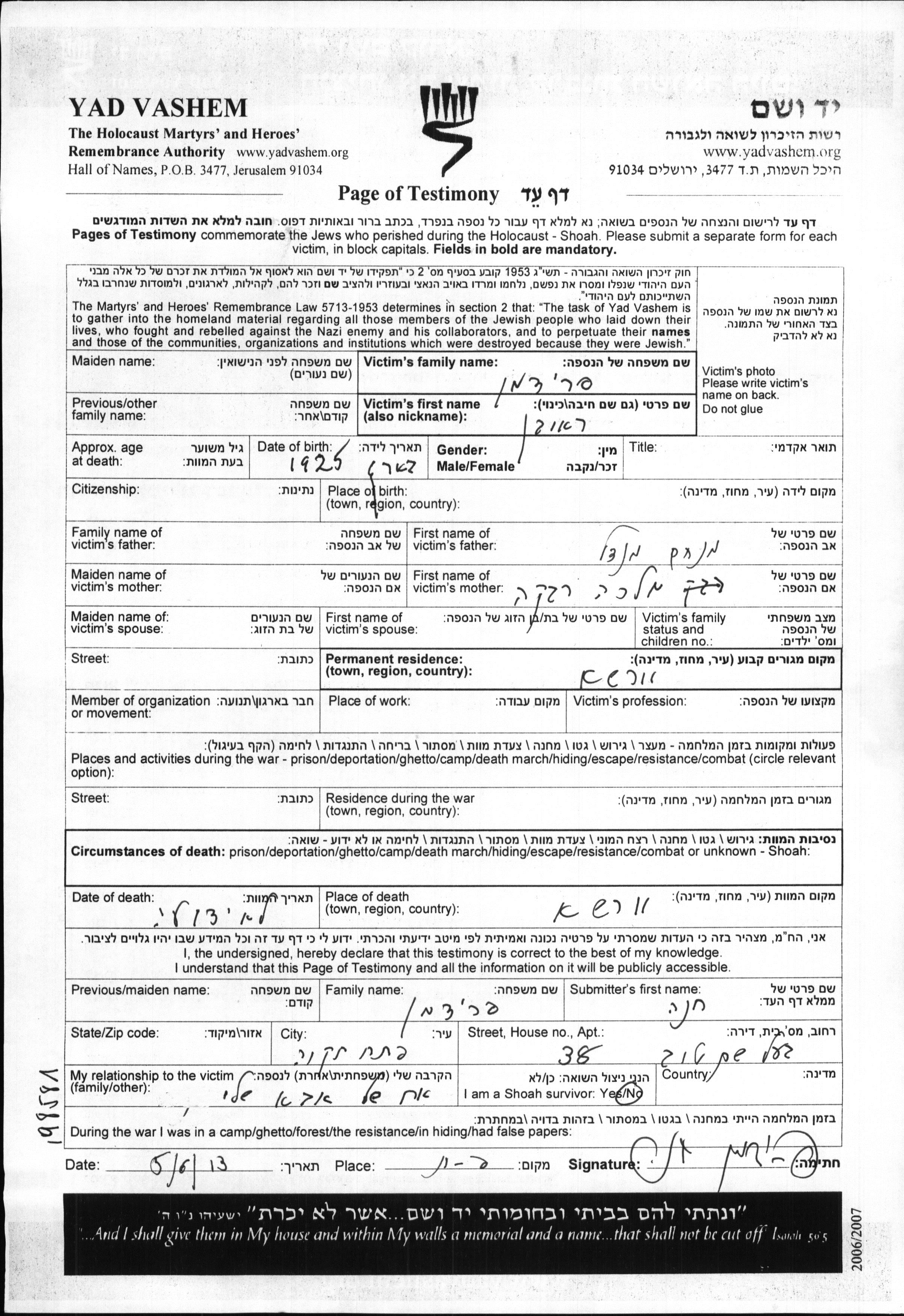 Yad Vashem - Pages of Testimony Names Memorial Collection
