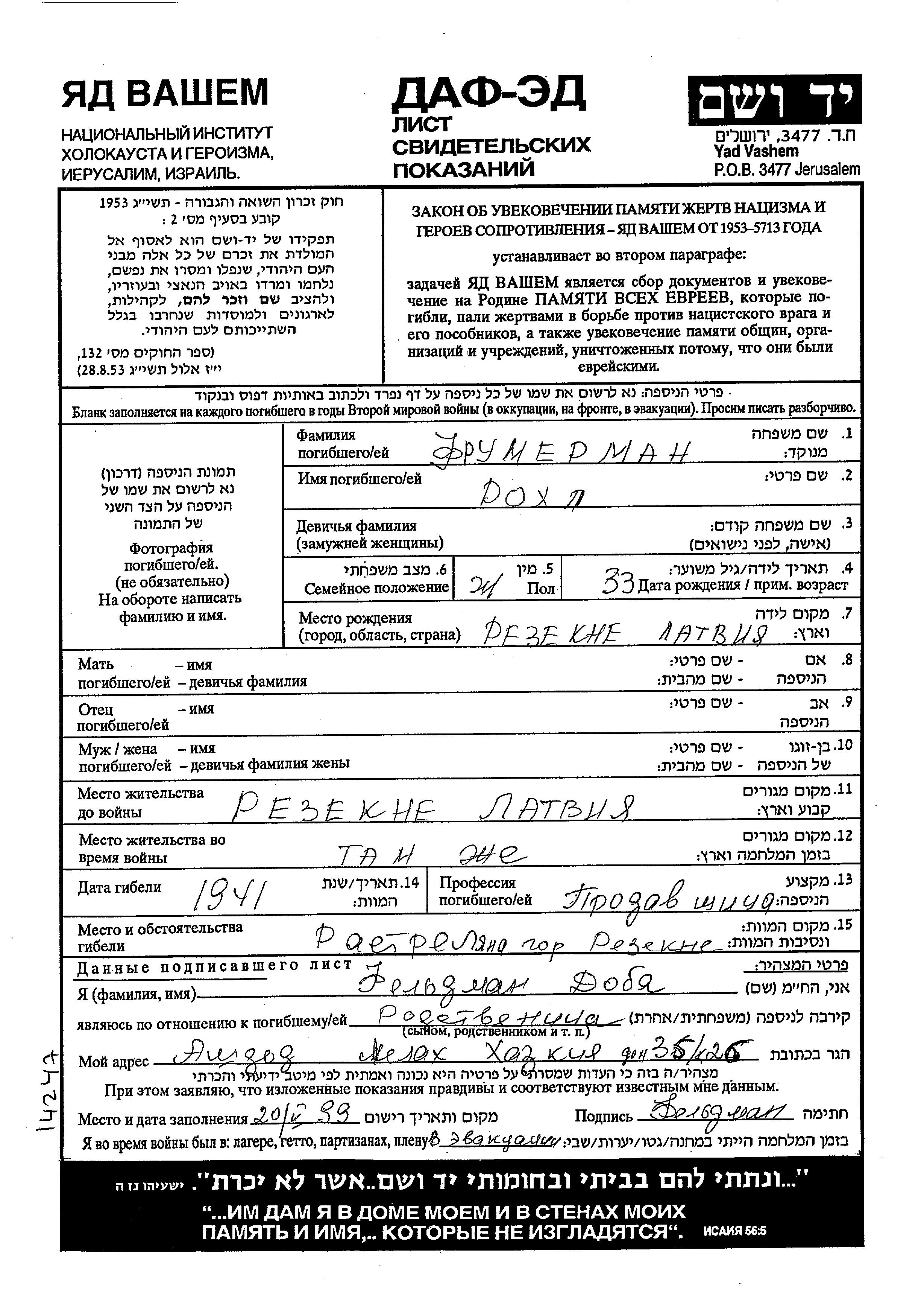Yad Vashem - Pages of Testimony Names Memorial Collection