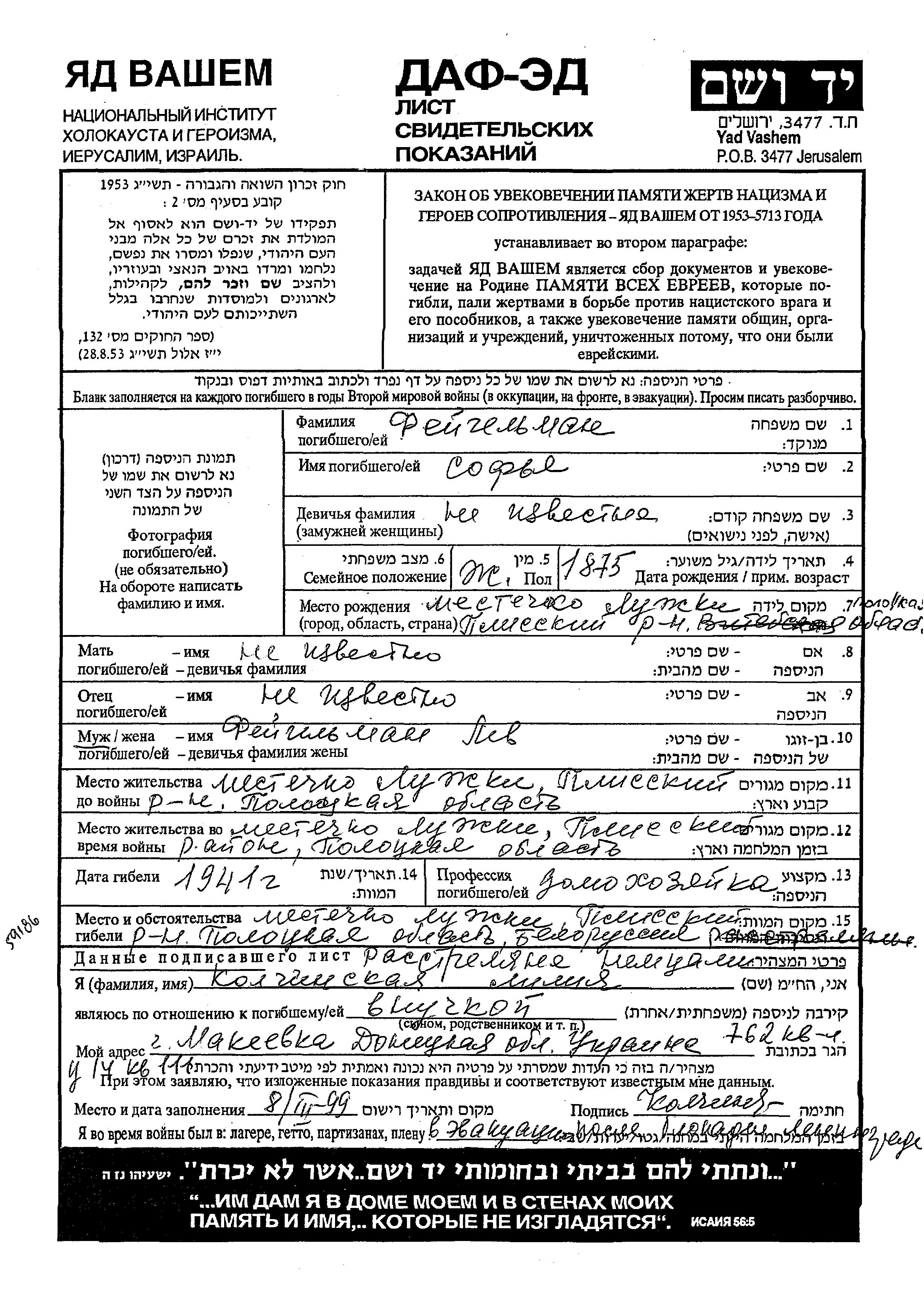 Yad Vashem - Pages of Testimony Names Memorial Collection