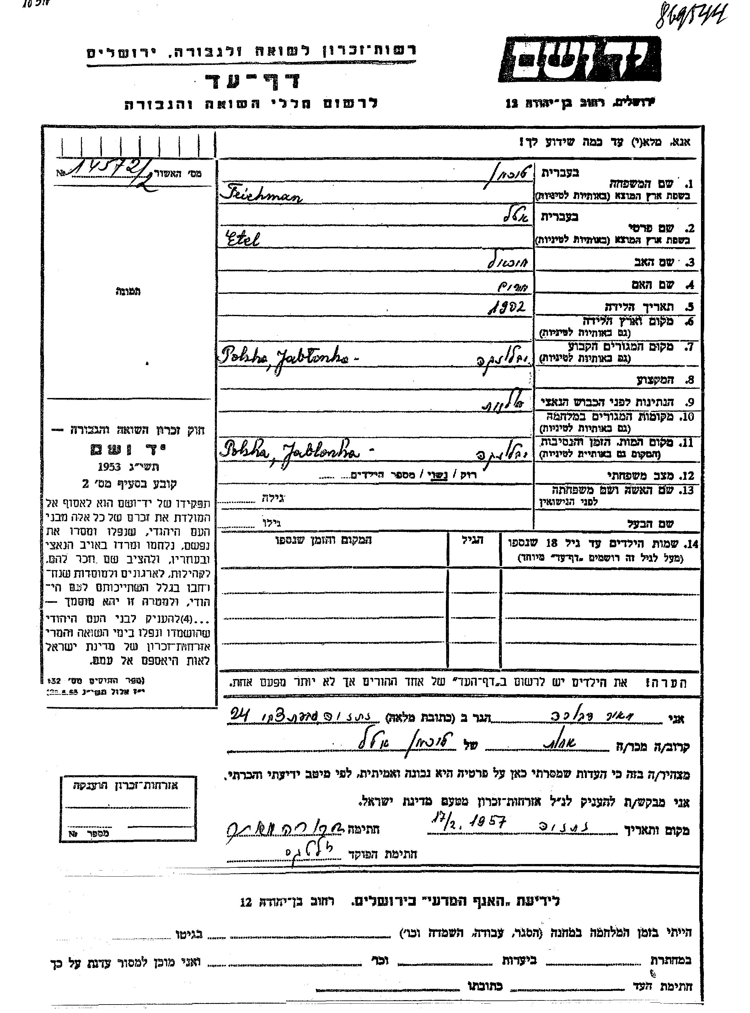 Teichman Tikhman Etel 1902 Jablonka, Pologne Feuille de témoignage
