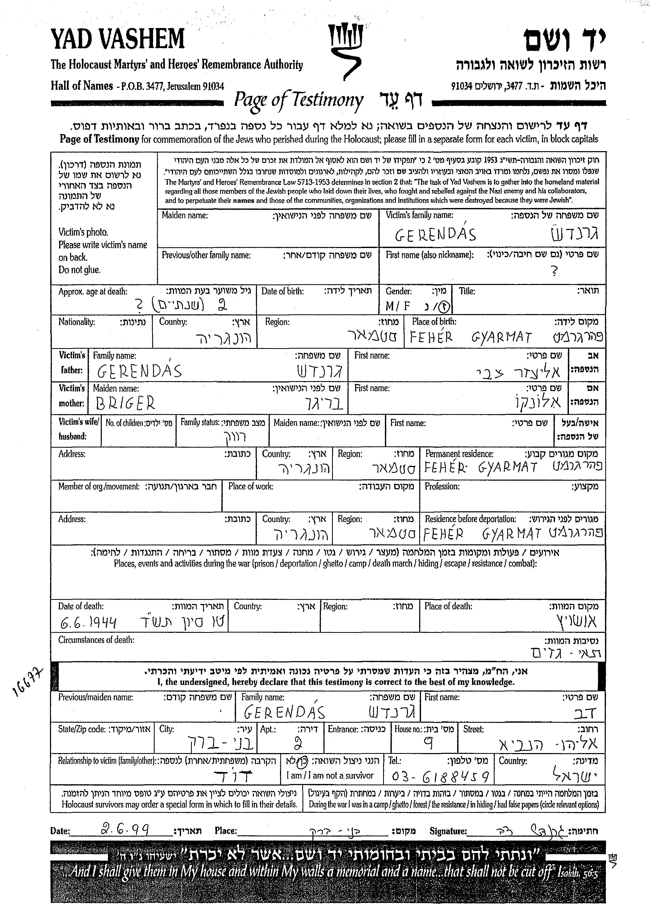 Gerendas prénom inconnu Fehergyarmat, Hongrie Feuille de témoignage