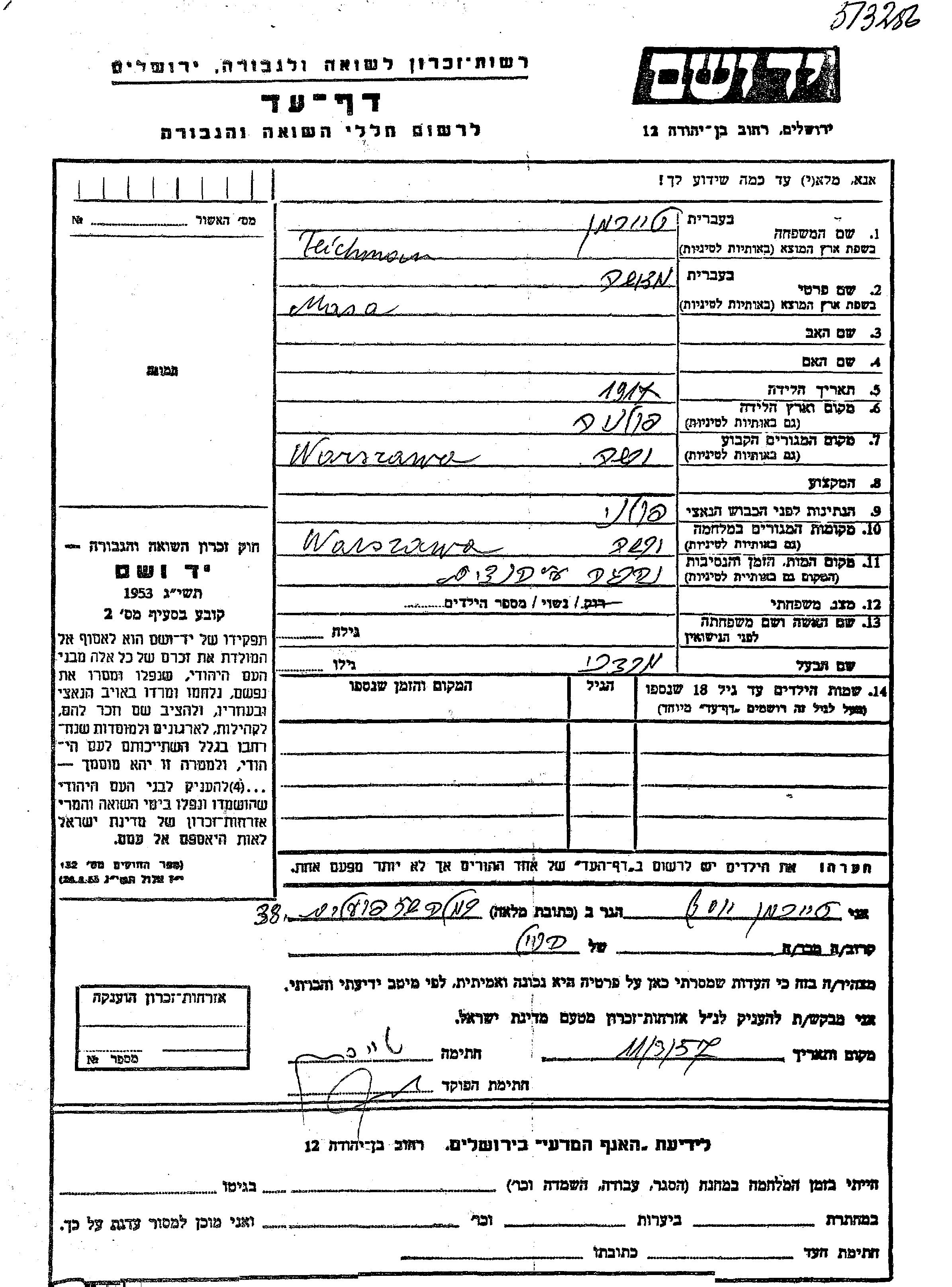 Masa Teichman est née à Pologne en 1917. Elle était Mariée à Mordekhai. Avant la seconde guerre mondiale elle vivait à Warszawa, Pologne. Pendant la guerre, elle était à Warszawa, Pologne.