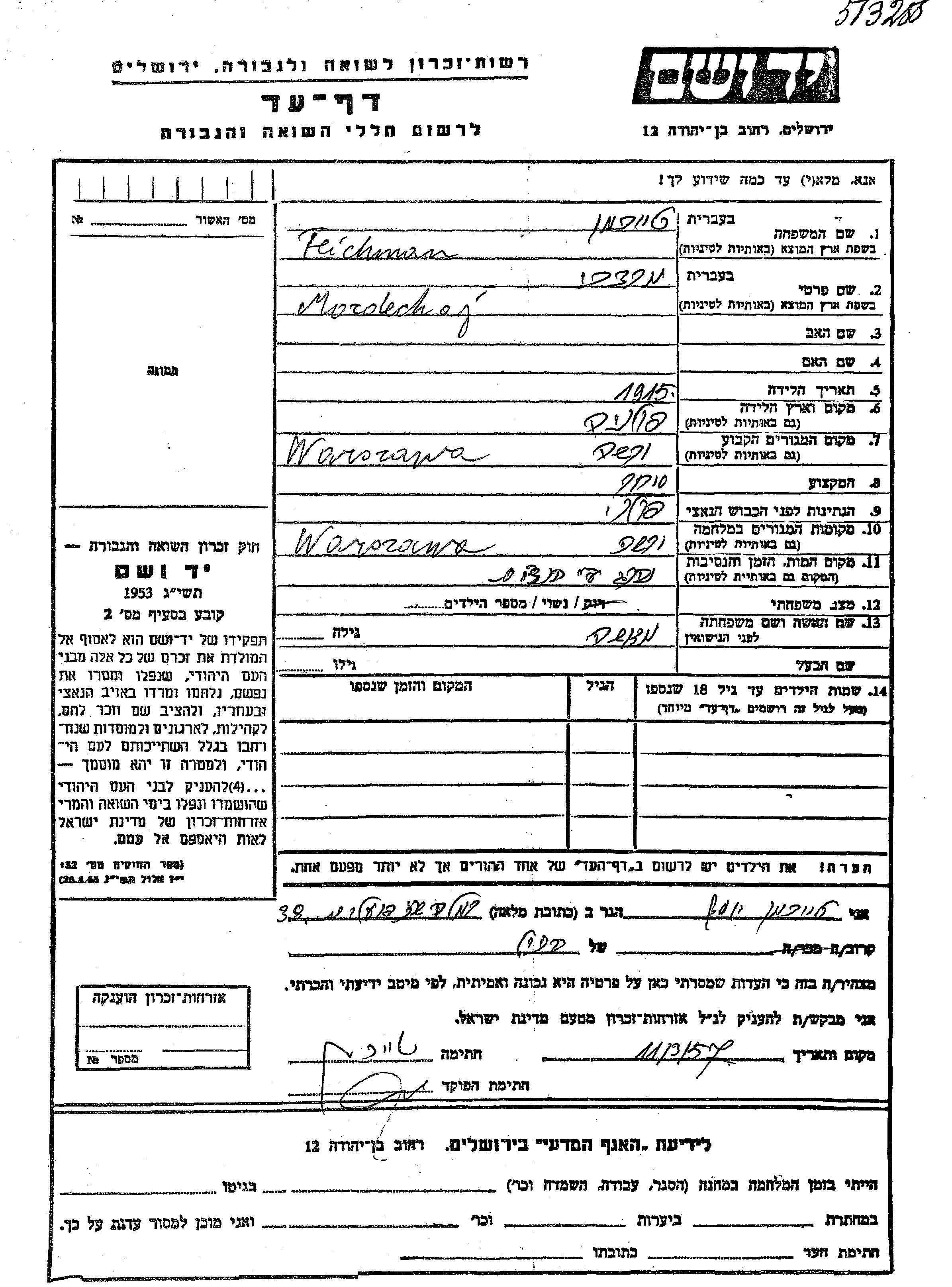 Mordechaj Teichman est né à Varsha, Pologne en 1915. Il était Commerçant/e et Mariée à Masha. Avant la seconde guerre mondiale il vivait à Varsha, Pologne. Au cours de la guerre, il était à Varsha, Pologne.