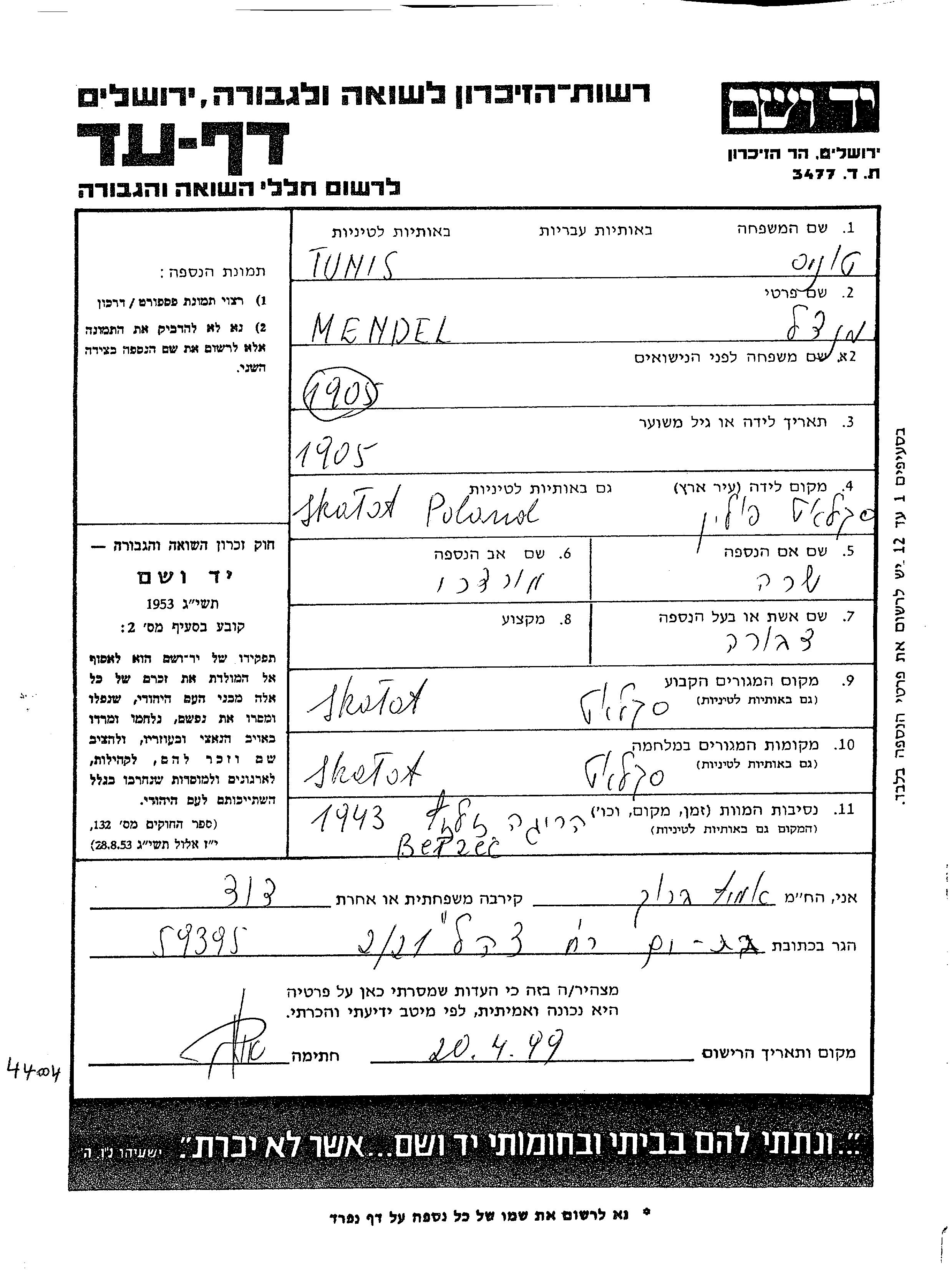 Tunis Mendel 1905 Skalat, Pologne Feuille de témoignage