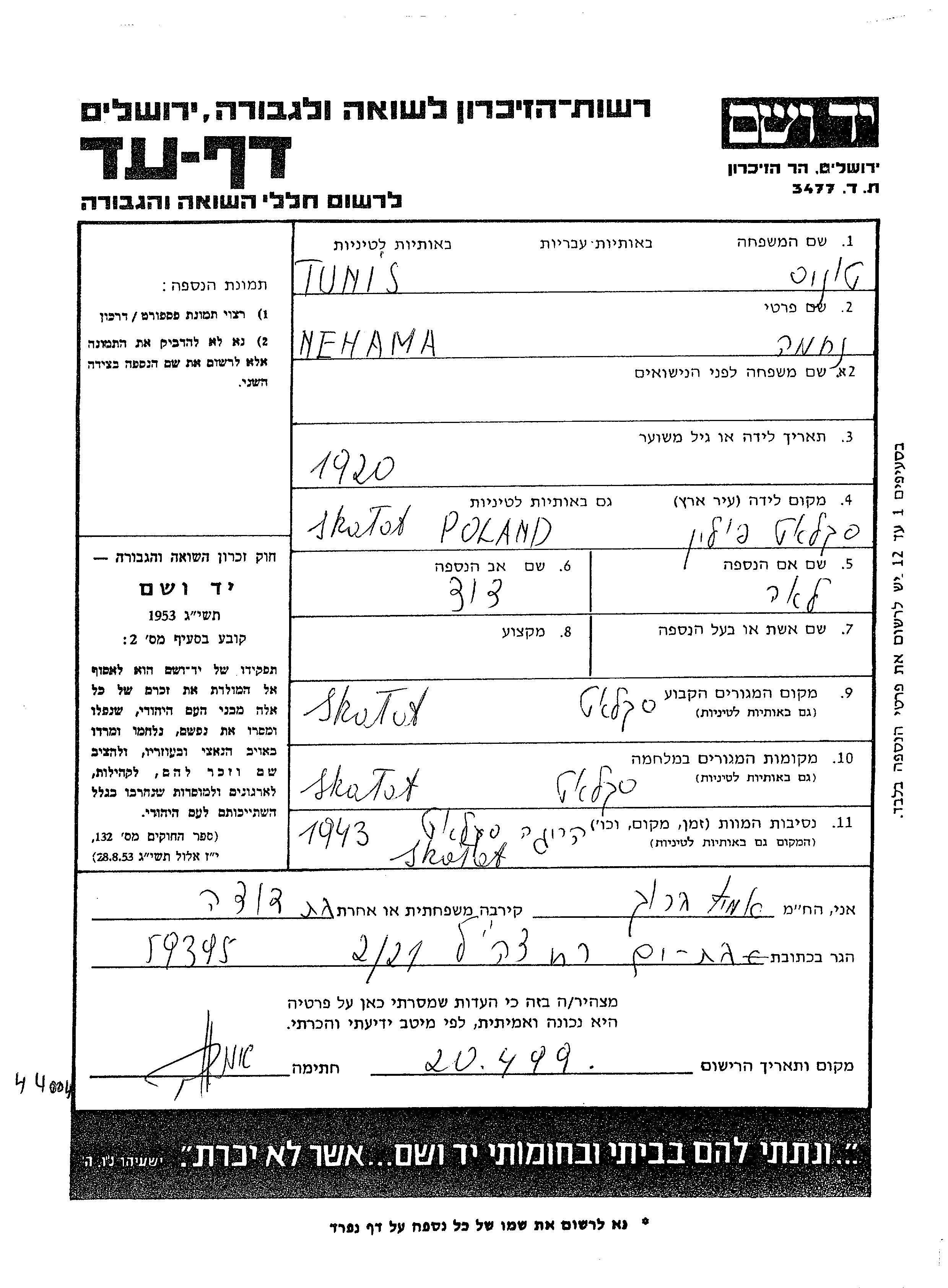 Tunis Nehama 1920 Skalat, Pologne Feuille de témoignage