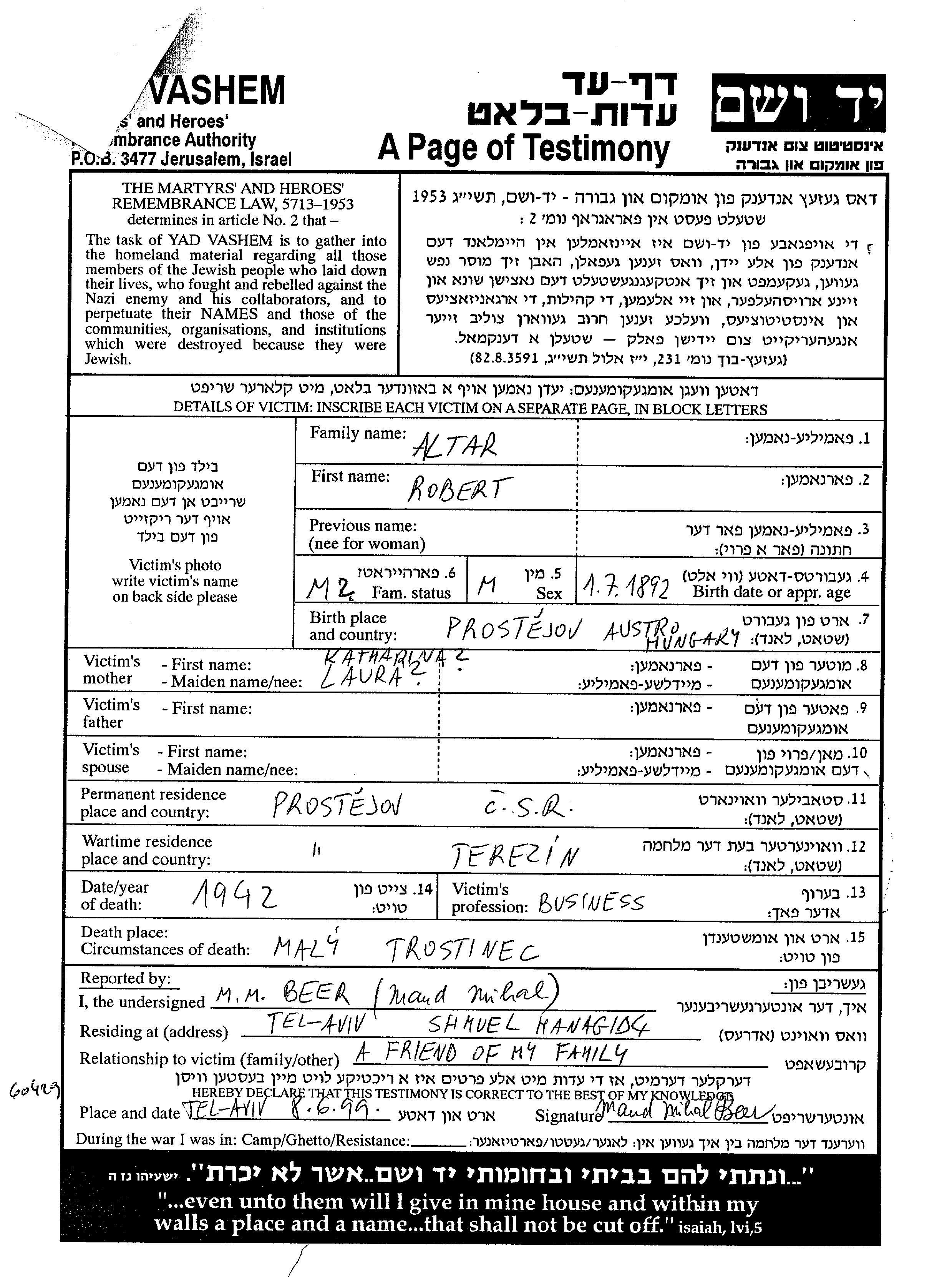 Robert Altar est né à Prostejov, Tchécoslovaquie en 1892, fils de Katharina Laura. Il était Homme d'affaire et Marié. Avant la seconde guerre mondiale il vivait à Prostejov, Tchécoslovaquie. Au cours de la guerre, il était à Theresienstadt, Tchécoslovaquie.