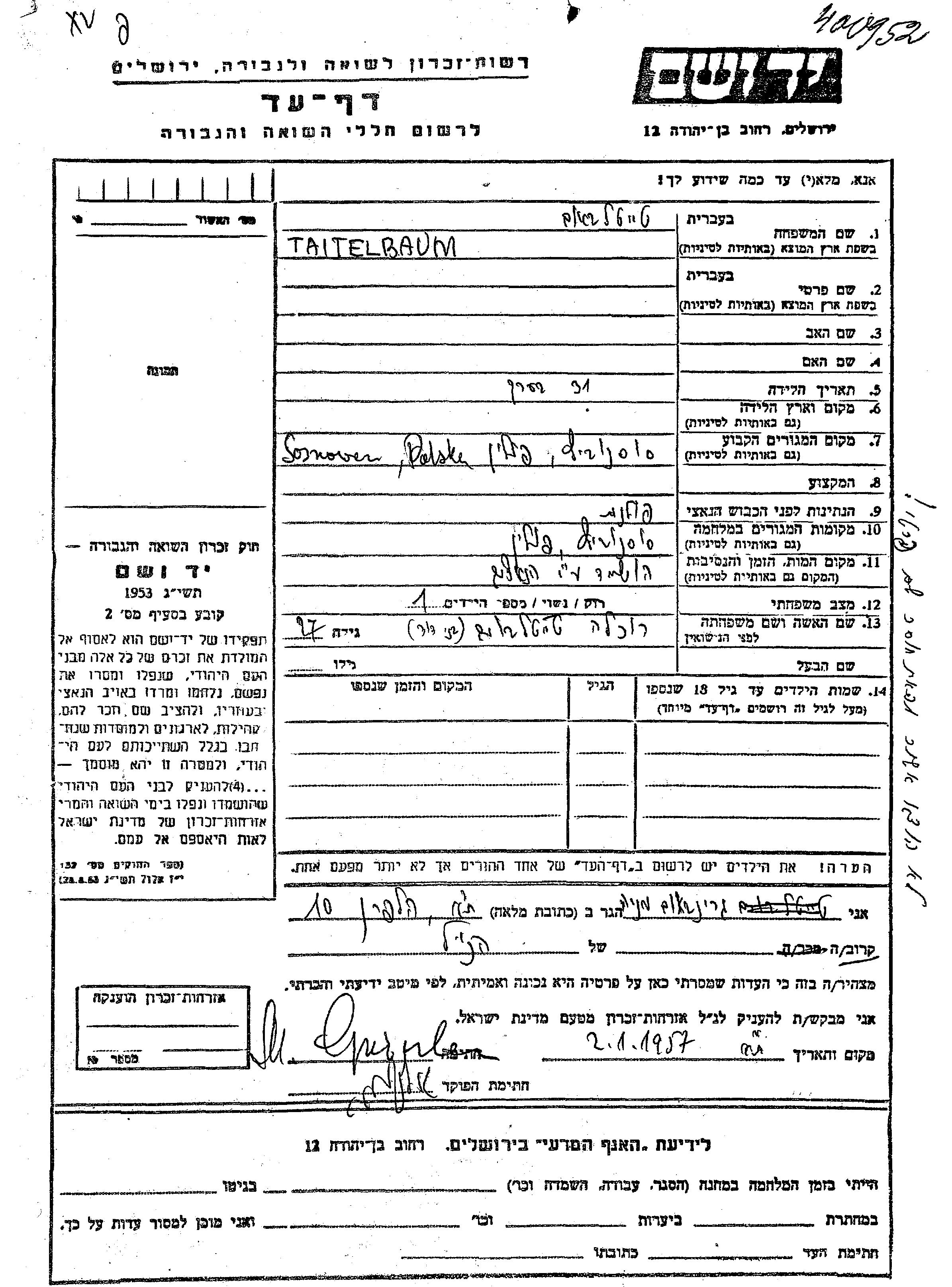 Taitelbaum prénom inconnu Sosnowiec, Pologne Feuille de témoignage