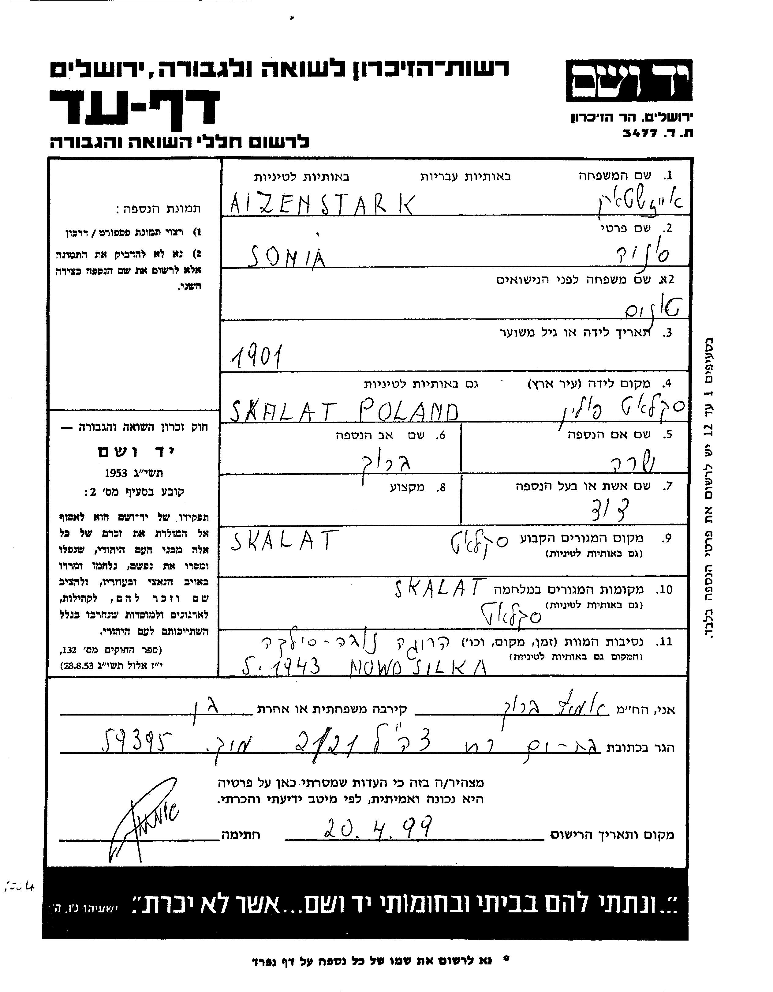 Aizenstark Sonia 1901 Skalat, Pologne Feuille de témoignage