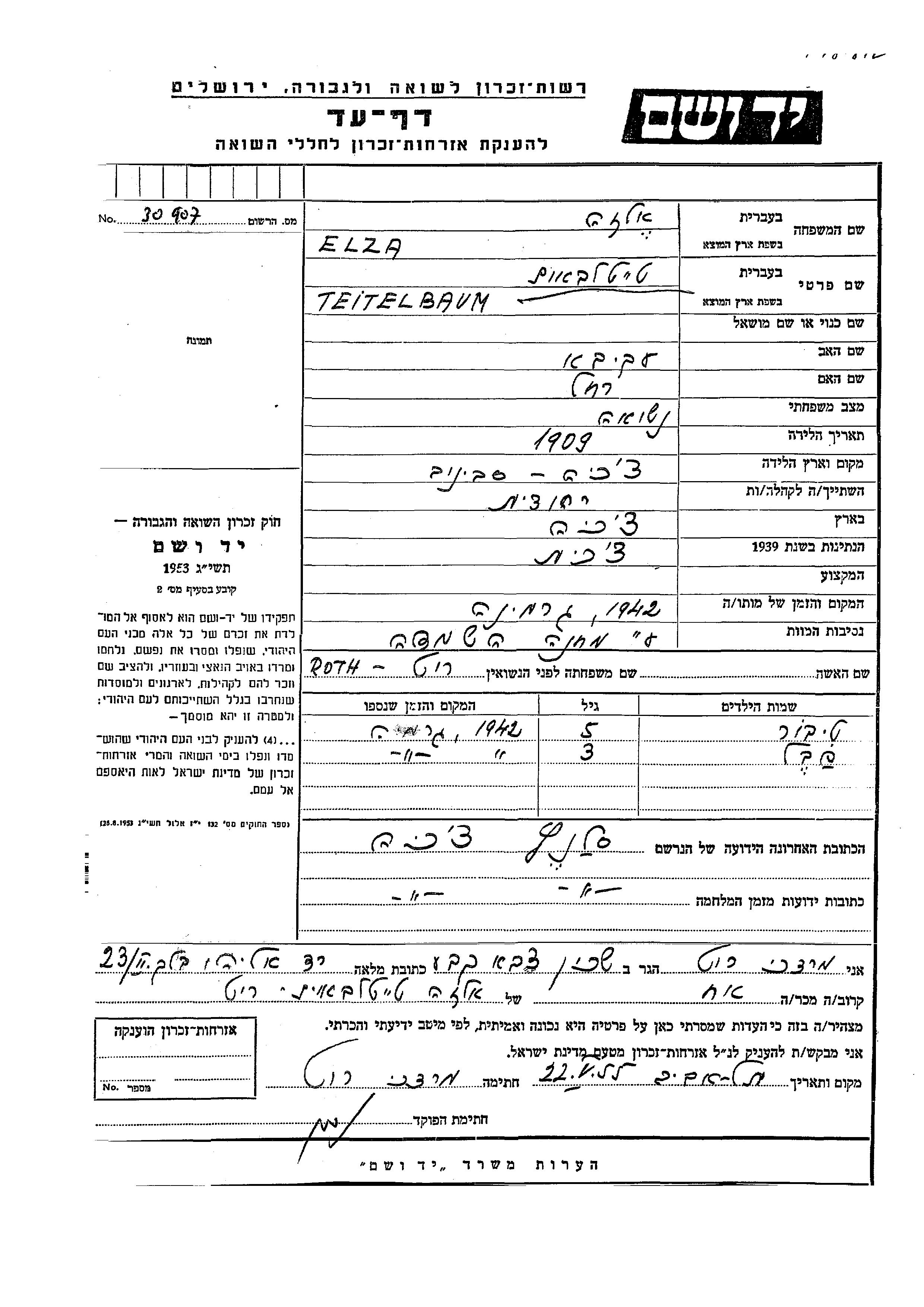 Teitelbaum Elza 1909 Tchécoslovaquie Feuille de témoignage