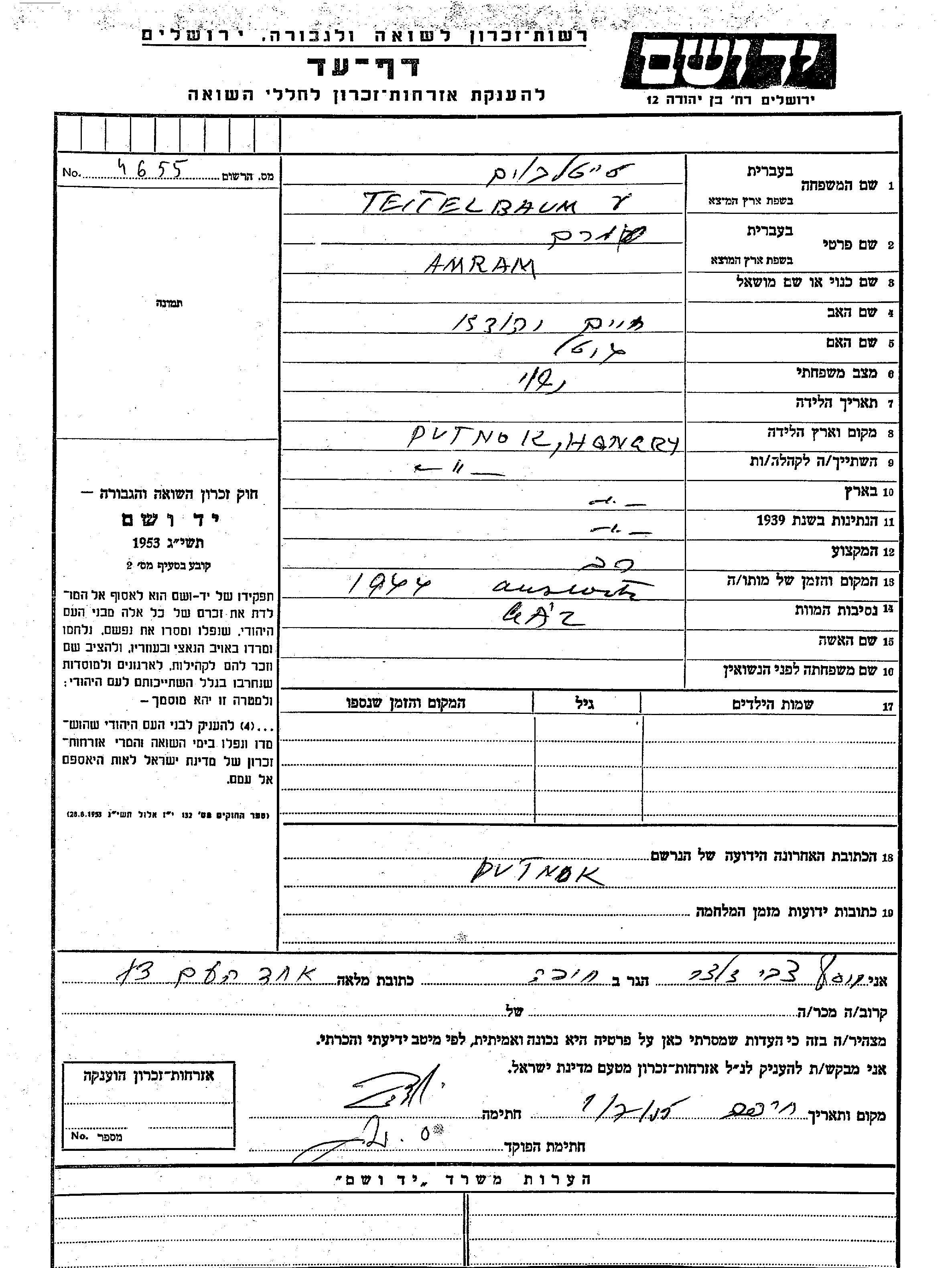 Teitelboim Amram Putnok, Hongrie Feuille de témoignage