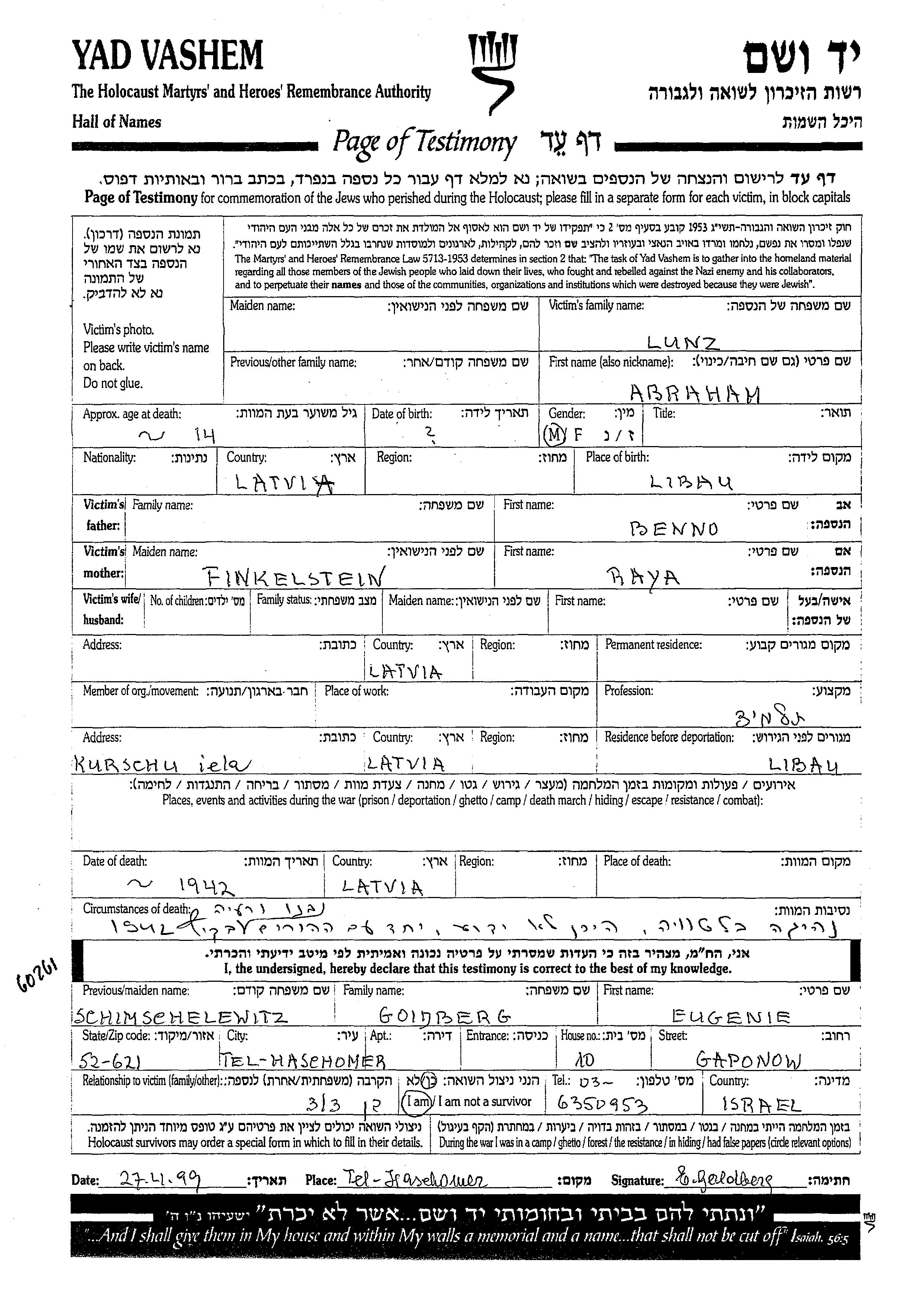 Abraham Lunz est né à Libau, Lettonie, fils de Benno et de Raya. Il était Élève. Avant la seconde guerre mondiale il vivait à Lettonie. Au cours de la guerre, il était à Libau, Lettonie.