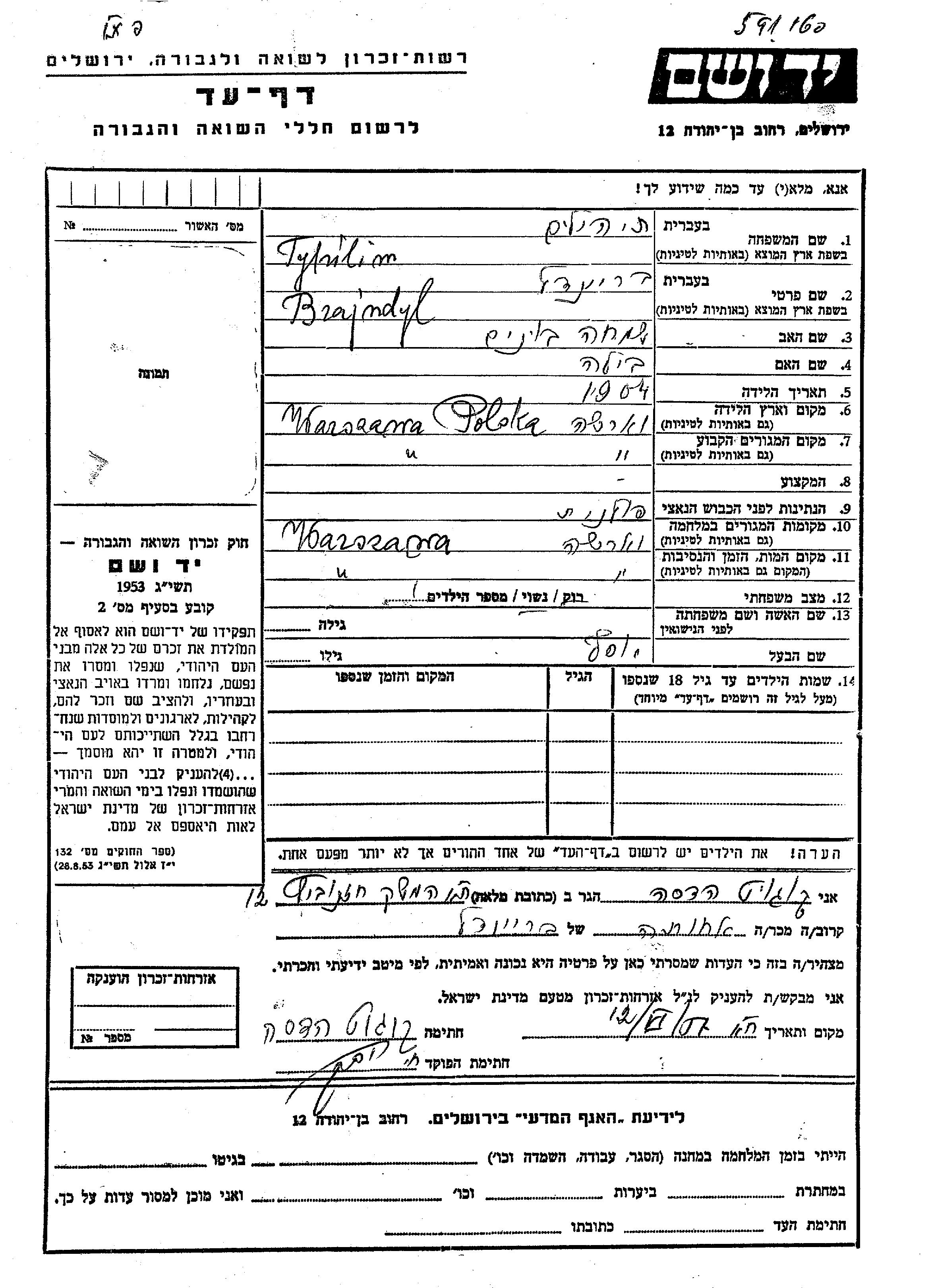 Brajndyl Tyhilim est née à Warszawa, Pologne en 1904, fille de Simkha Bunim et de Bila. Elle était Mariée à Yosef. Avant la seconde guerre mondiale elle vivait à Warszawa, Pologne. Pendant la guerre, elle était à Warszawa, Pologne.