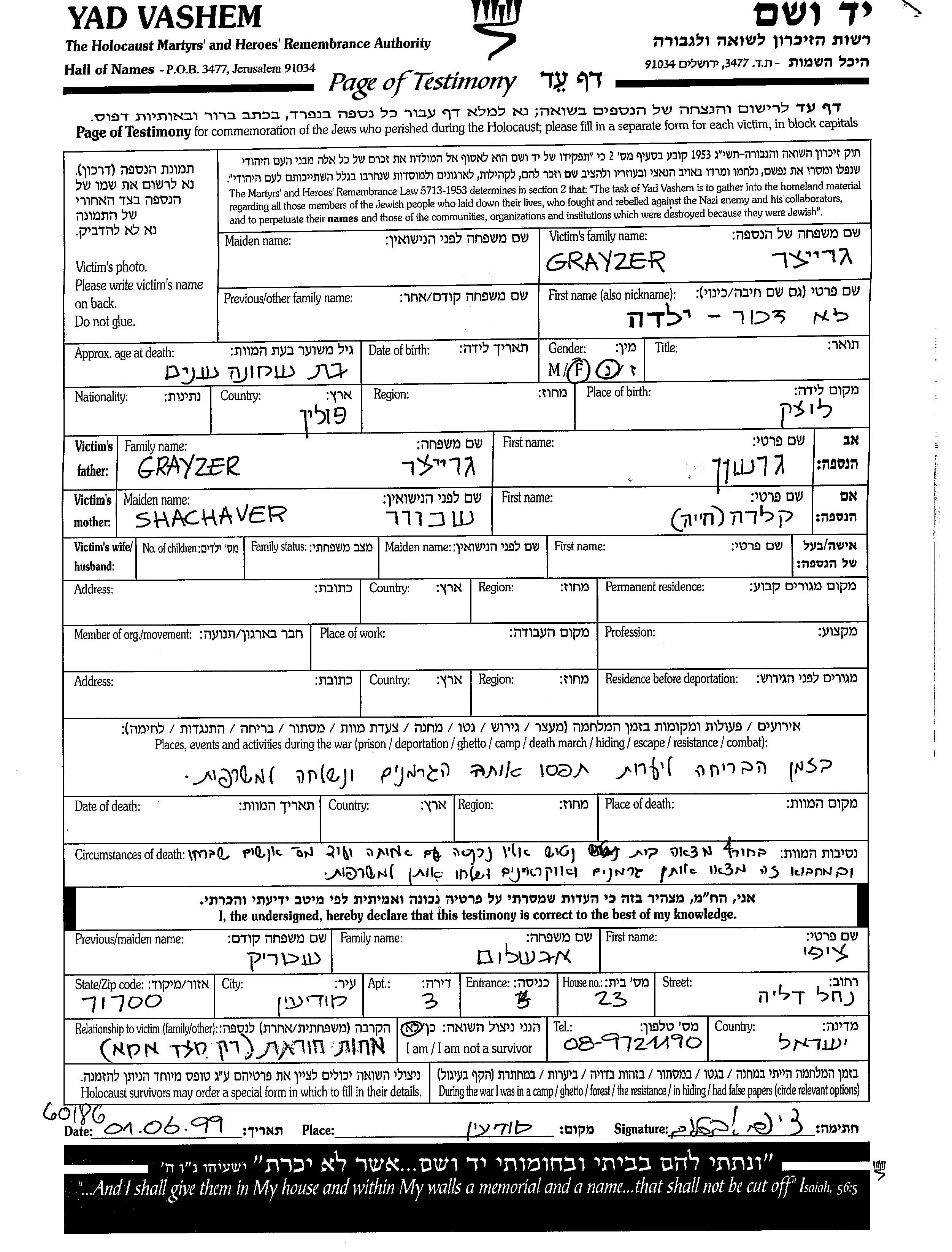 Yad Vashem - Pages of Testimony Names Memorial Collection