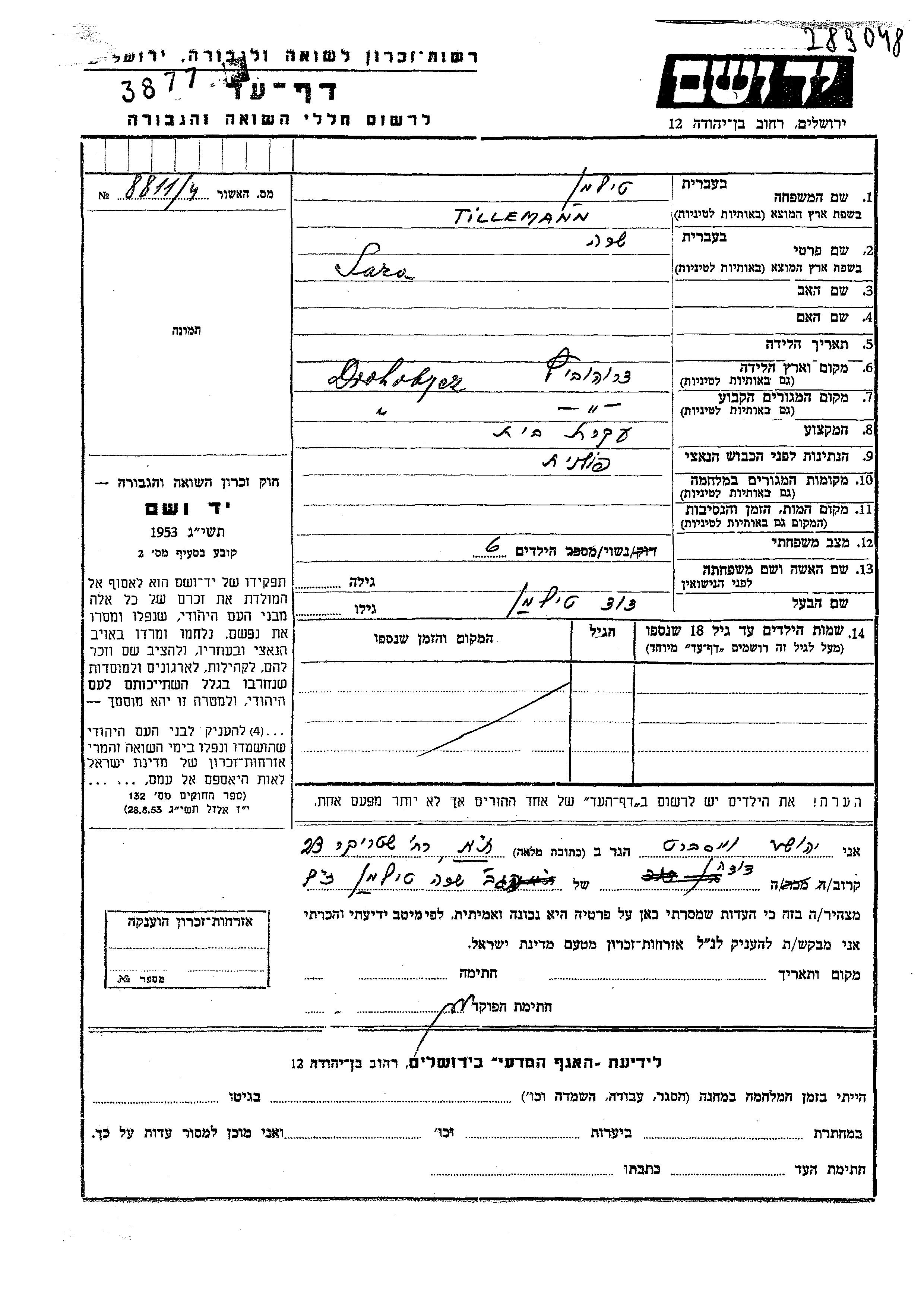 Tillemann Sara Drohobycz, Pologne Feuille de témoignage
