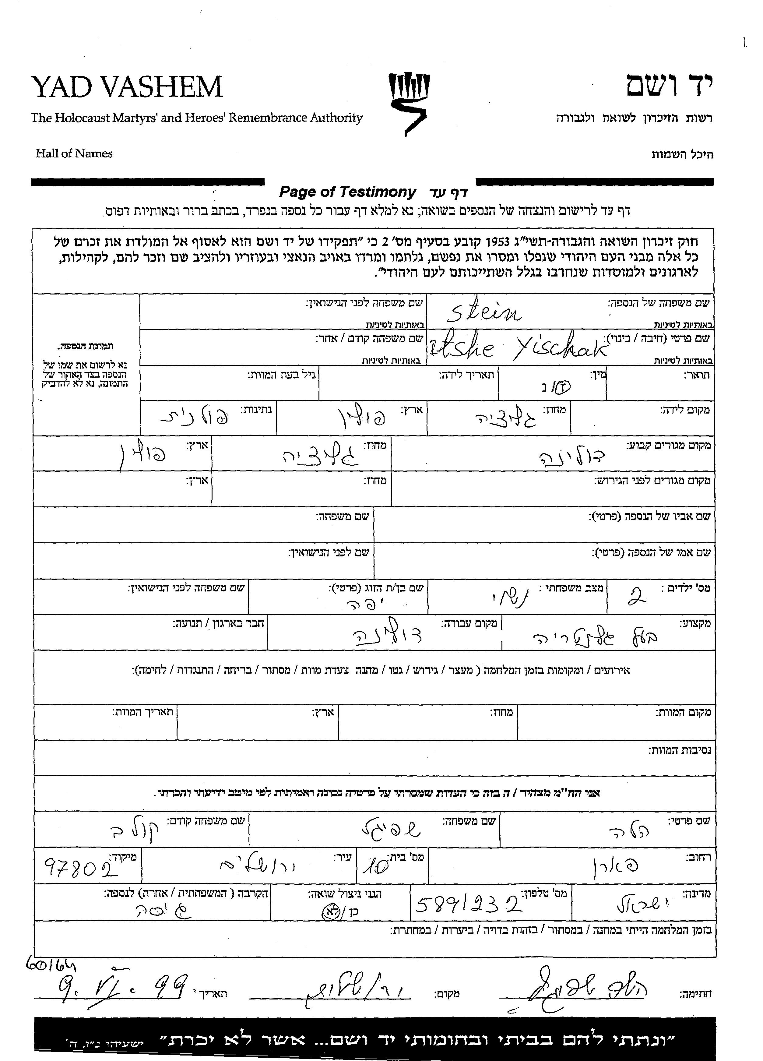 Itshe Stein est né à Galicia Region, Pologne. Il était Propriétaire d'une mercerie et Mariée à Yafa. Avant la seconde guerre mondiale il vivait à Dolina, Pologne.