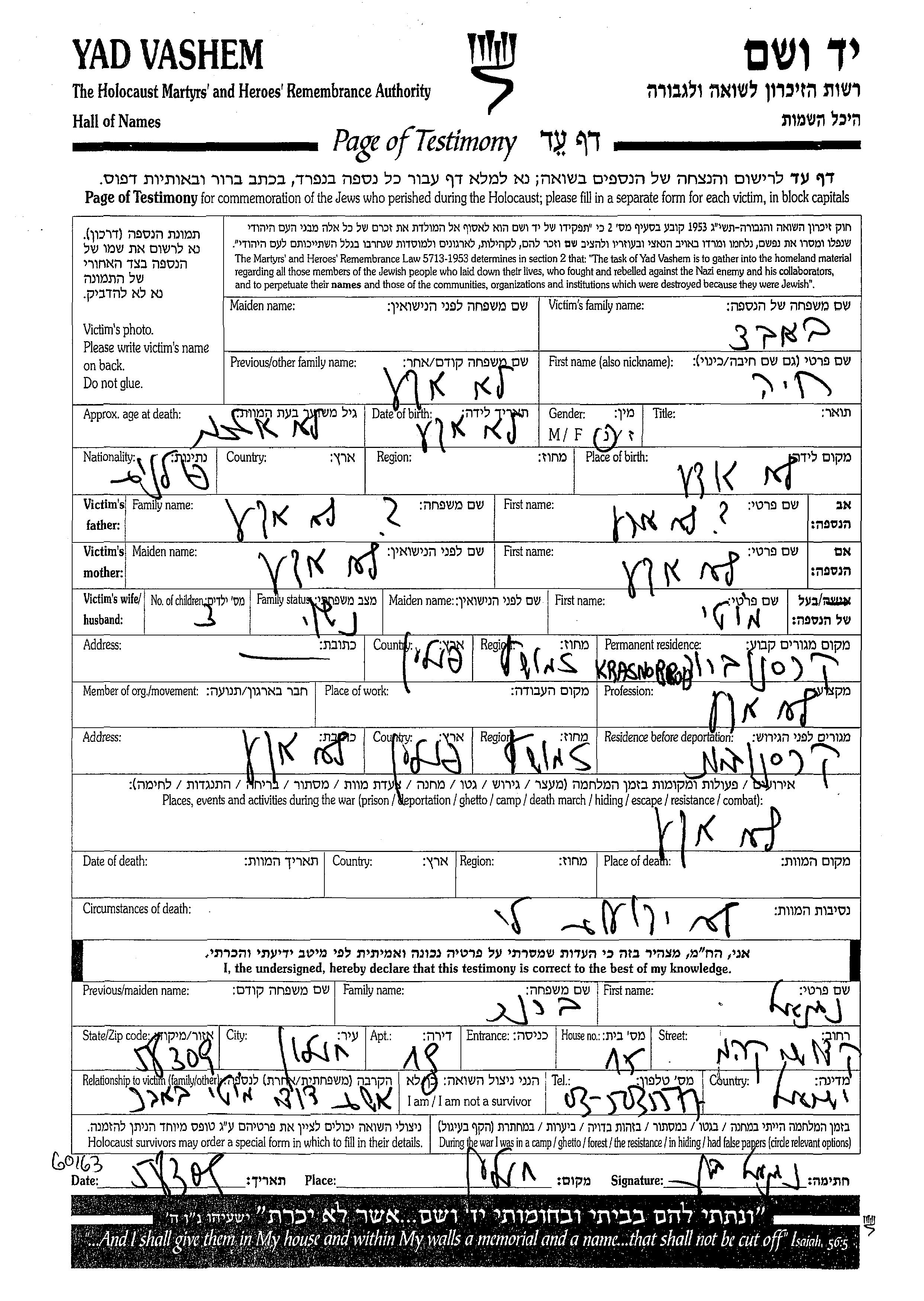 Yad Vashem - Pages of Testimony Names Memorial Collection