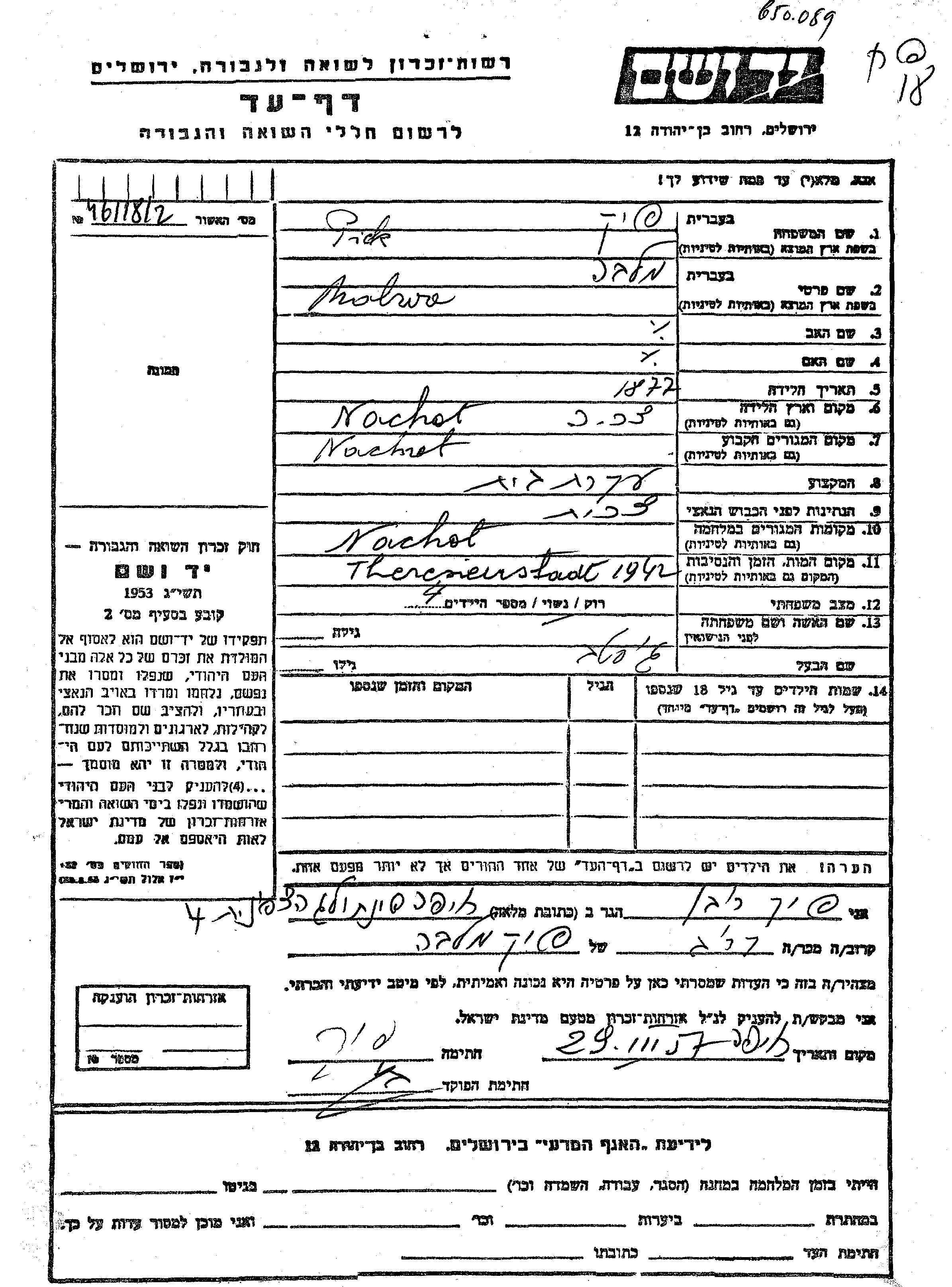 Yad Vashem - Pages of Testimony Names Memorial Collection