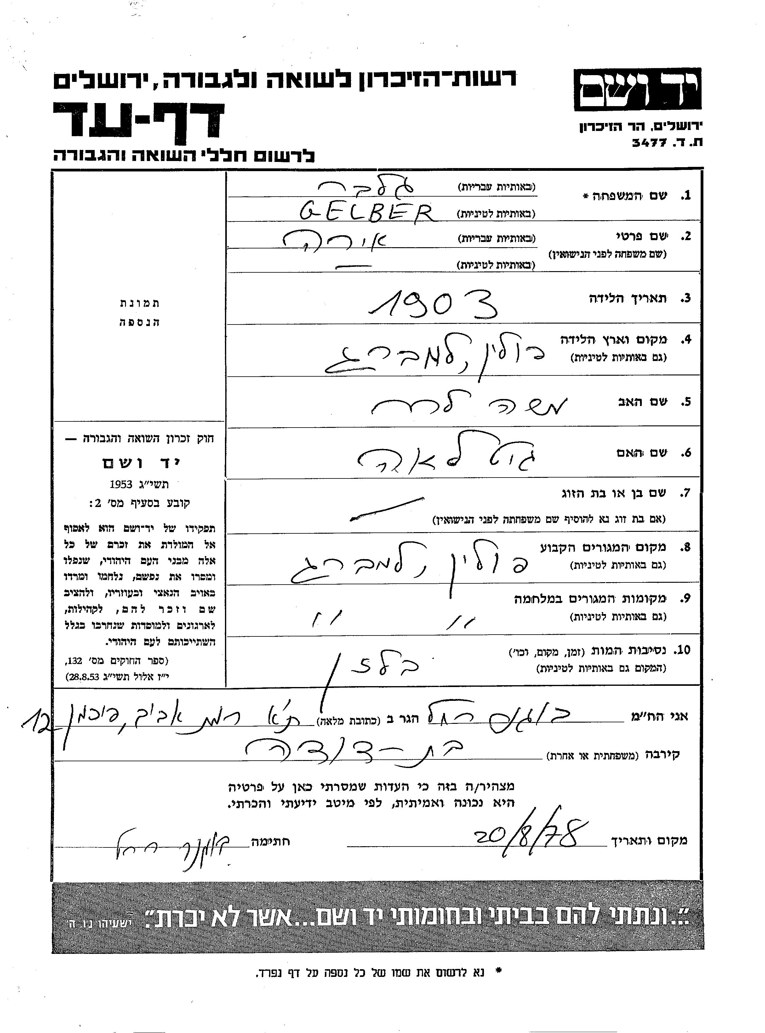 Ire Gelber est née à Lemberg, Pologne en 1903, fille de Moshe et de Git Lea. Avant la seconde guerre mondiale elle vivait à Lemberg, Pologne. Pendant la guerre, elle était à Lemberg, Pologne.