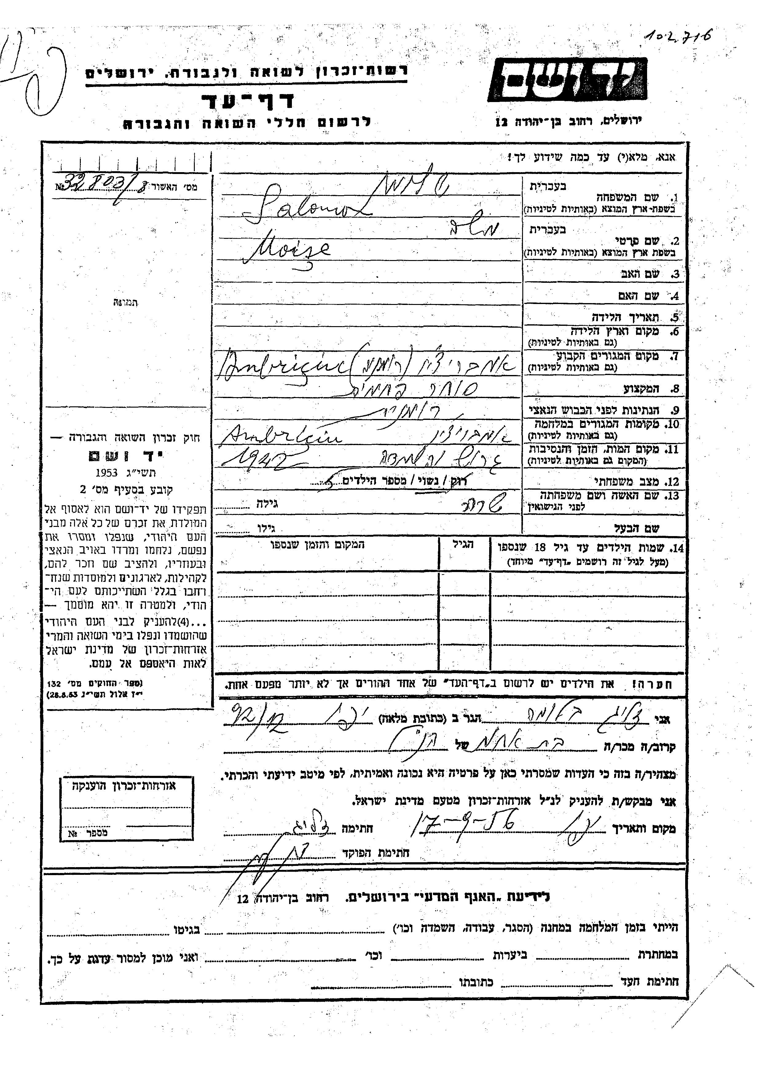 Moise Salomon Shloman. Il était Marchand de charbon et Mariée à Sara. Avant la seconde guerre mondiale il vivait à Huberwiszo, Roumanie. Au cours de la guerre, il était à Huberwiszo, Roumanie.