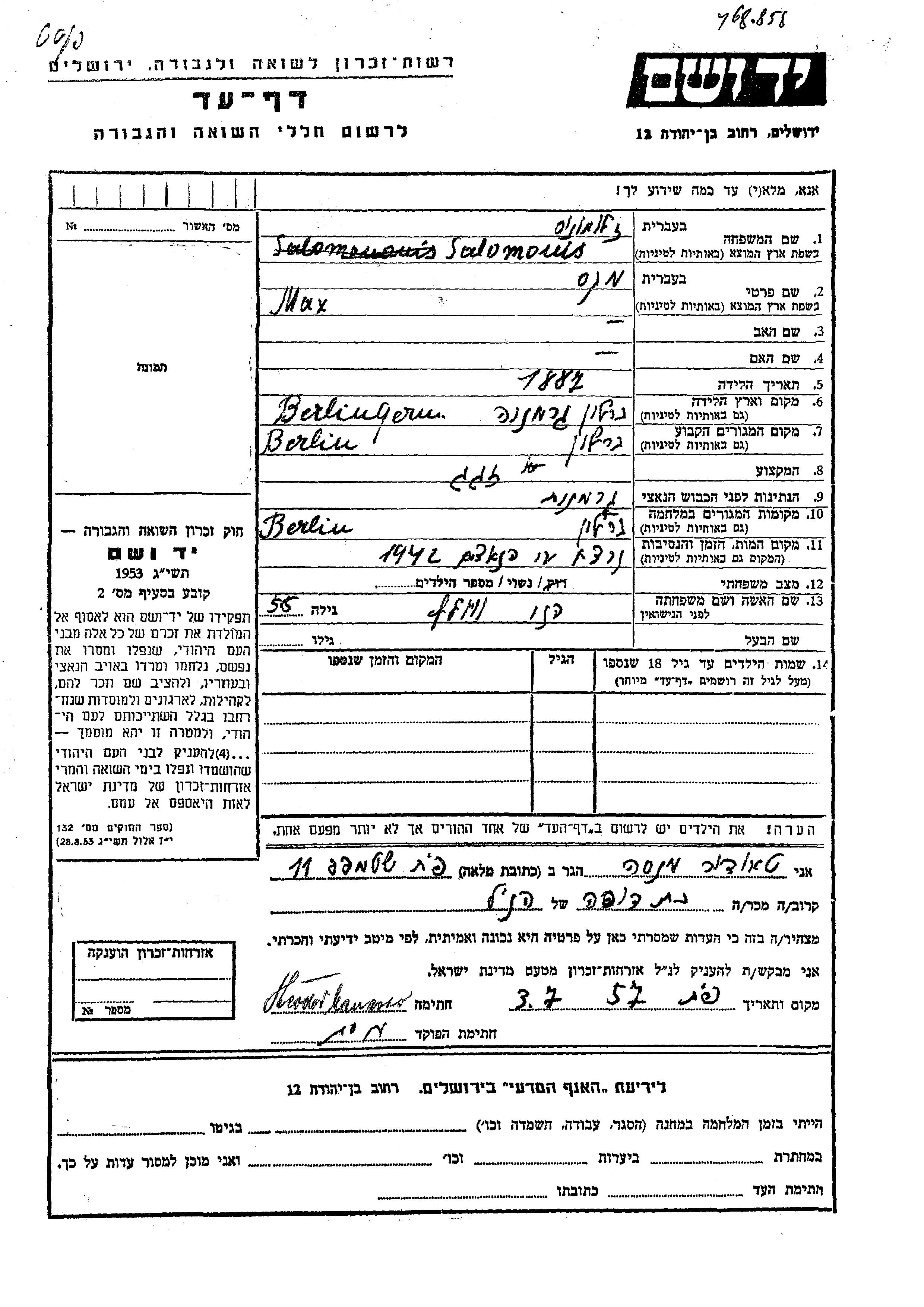 Max Salomonis est né à Berlin, Allemagne en 1887. Il était Vitrier et Mariée à Heni née Volf. Avant la seconde guerre mondiale il vivait à Berlin, Allemagne. Au cours de la guerre, il était à Berlin, Allemagne.