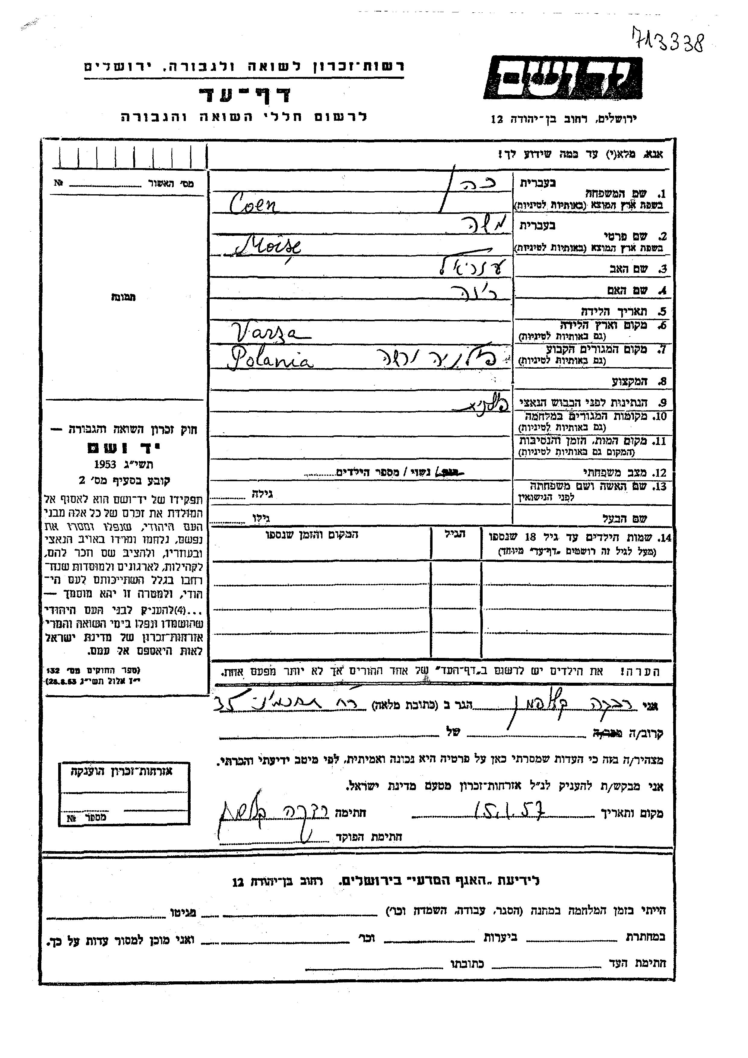 Coen Moise Varsha, Pologne Feuille de témoignage