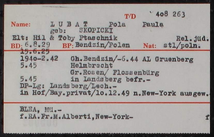 Pesil Lubat Skopicki née Skopicka est née en 1925. Avant la seconde guerre mondiale elle vivait à Będzin, Pologne.