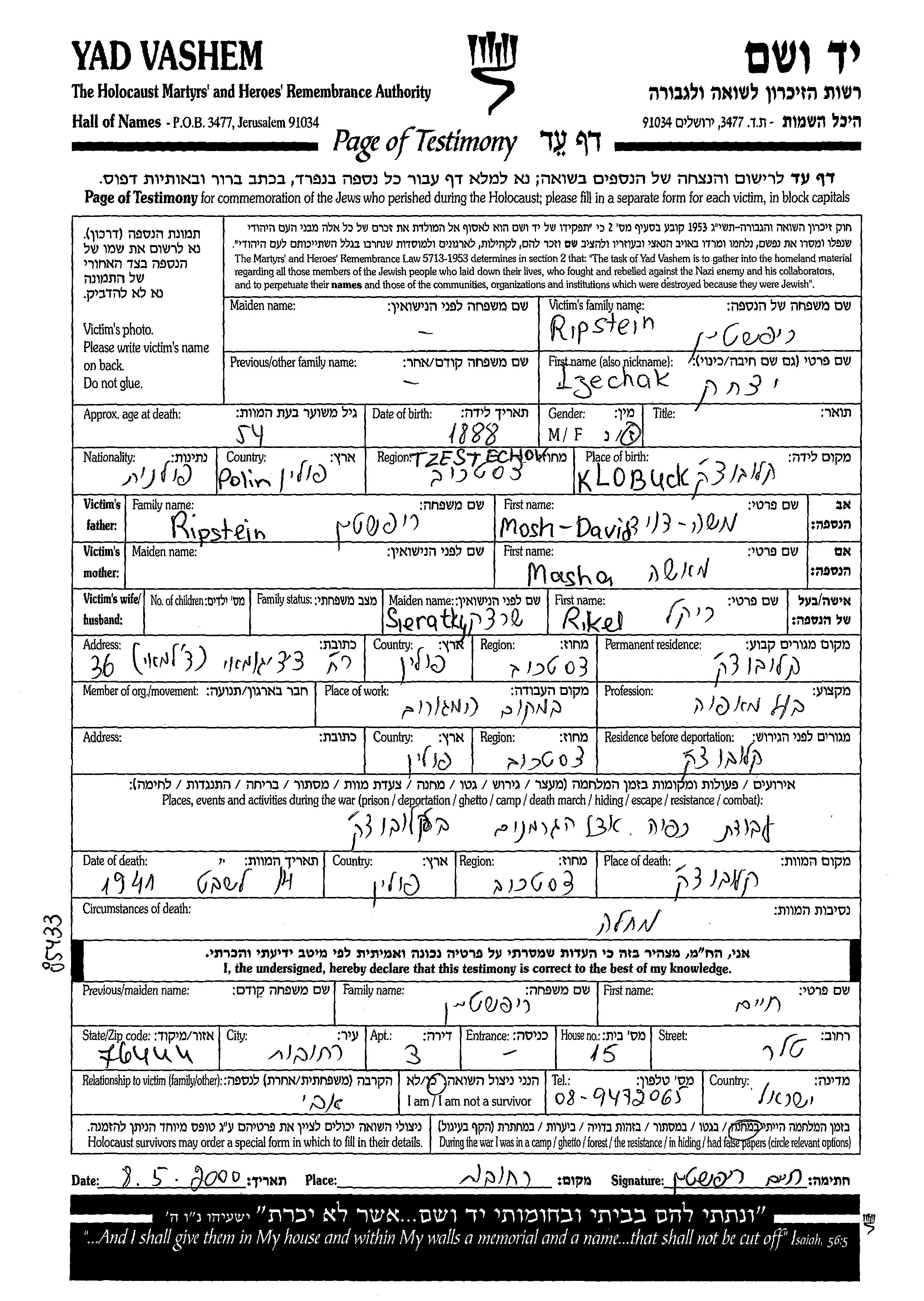 Ripstein Izechak 1888 Klobuck, Pologne Feuille de témoignage