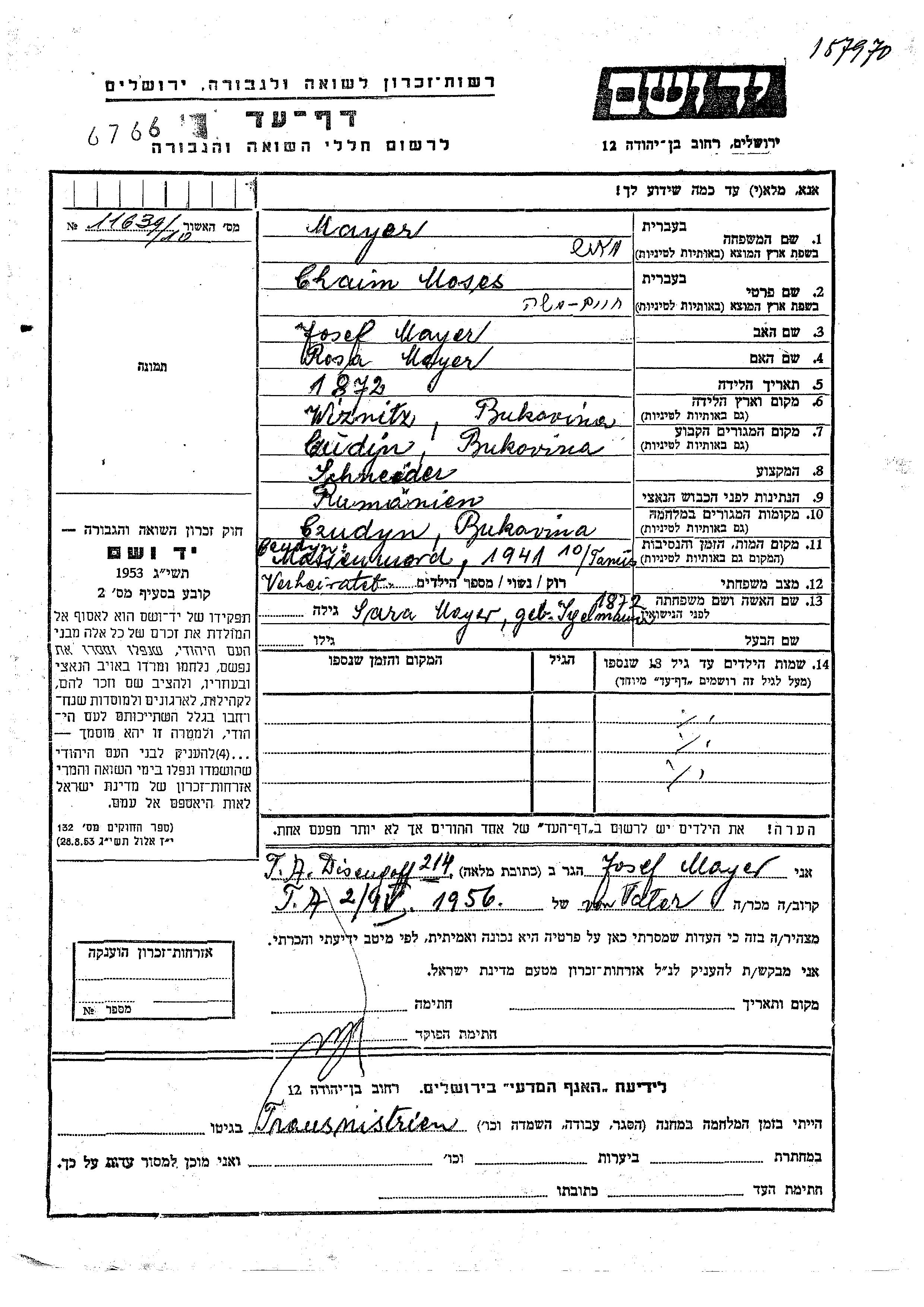 Chaim Moses Mayer est né à Wiznitz, Roumanie en 1872, fils de Yosef et de Rosa. Il était Tailleur et Mariée à Sara. Avant la seconde guerre mondiale il vivait à Ciudin, Roumanie. Au cours de la guerre, il était à Ciudin, Roumanie.