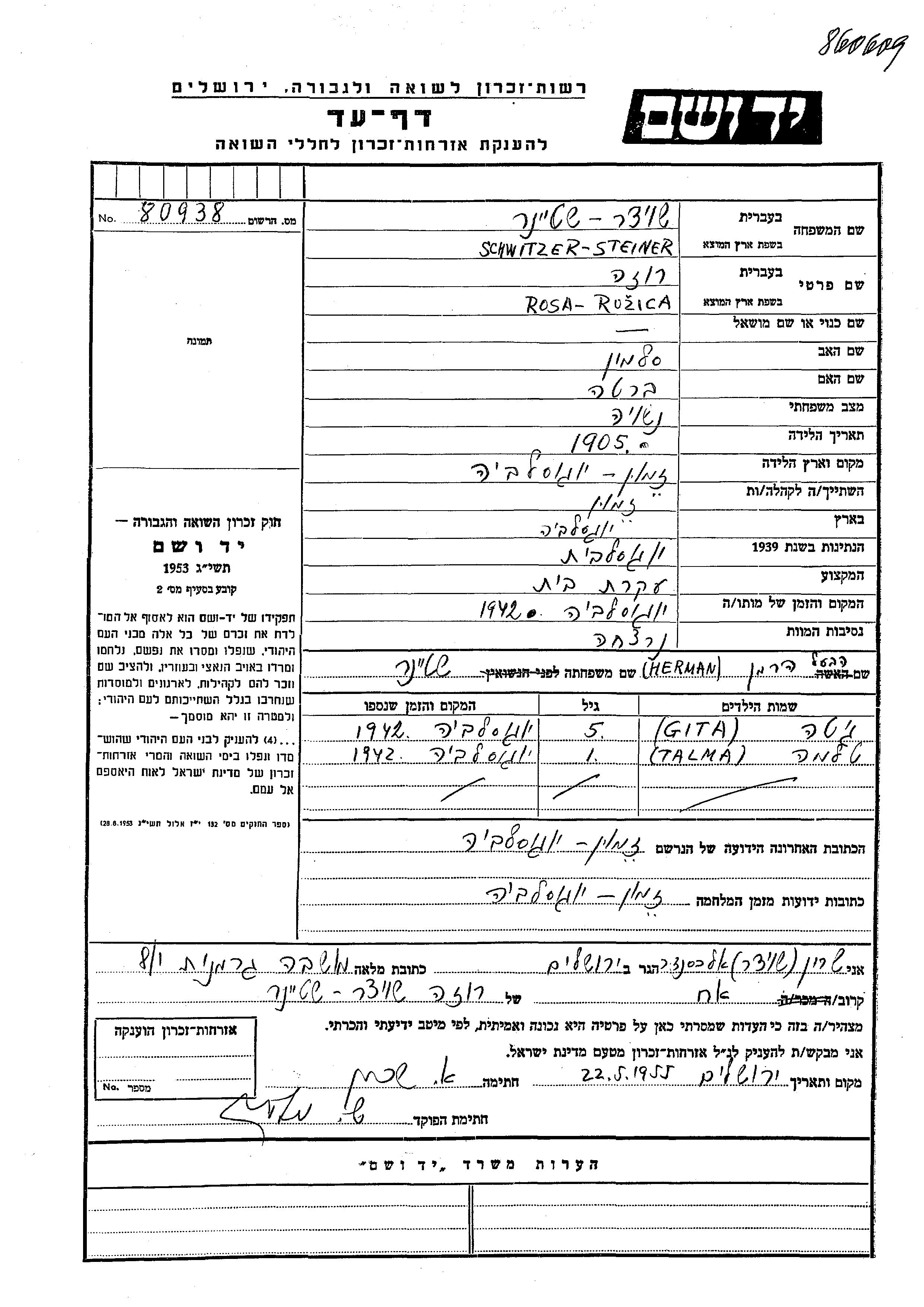 Rosa Steiner née Schwitzer est née à Zemun, Yugoslavie en 1905, fille de Salamon et de Berta. Elle était Femme au foyer et Mariée à Herman. Avant la seconde guerre mondiale elle vivait à Zemun, Yugoslavie. Pendant la guerre, elle était à Zemun, Yugoslavie.