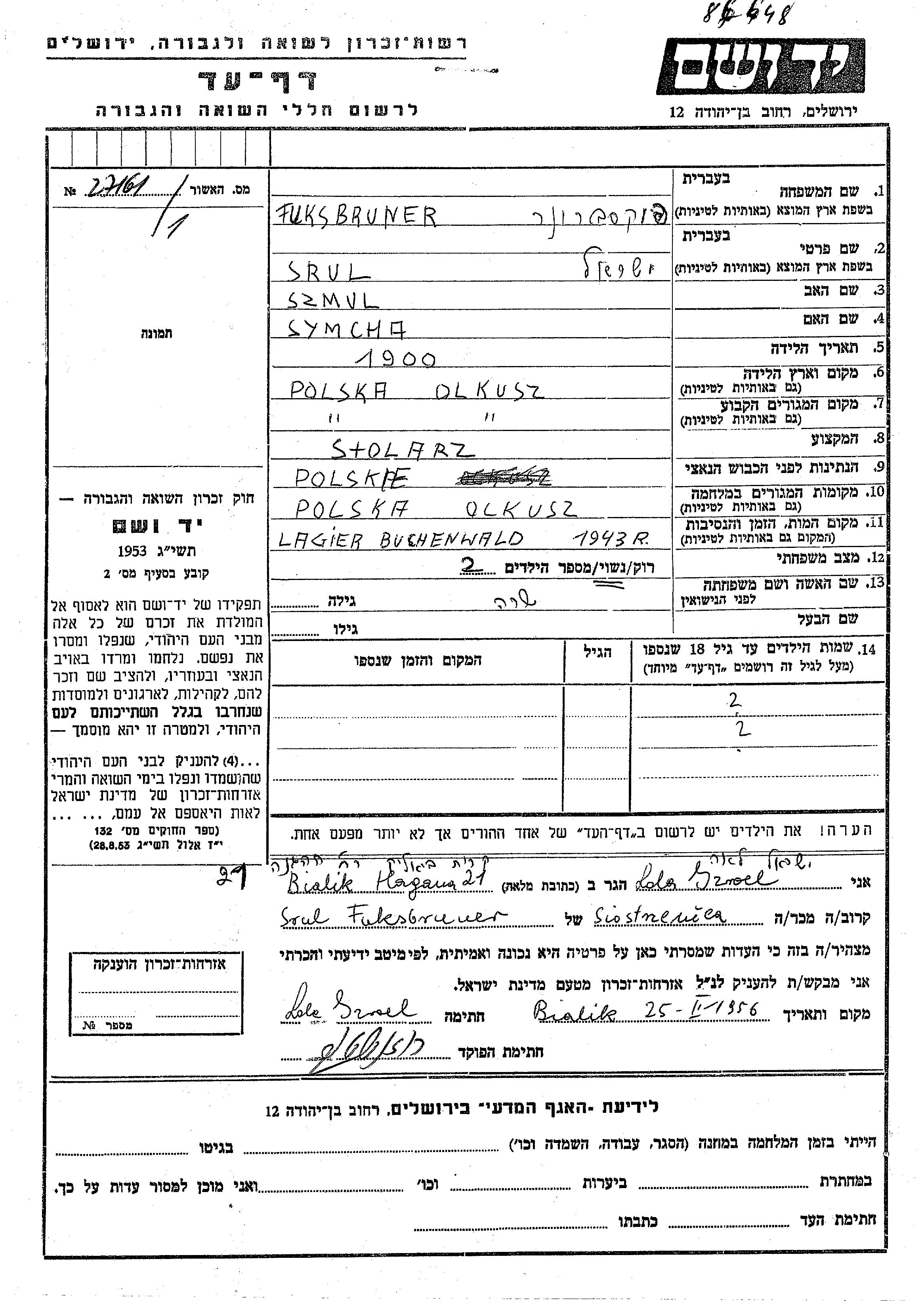Fuksbruner Srul 1900 Olkusz, Pologne Feuille de témoignage
