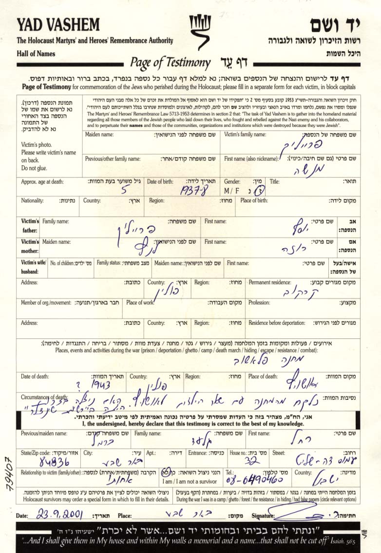 Yad Vashem - Pages of Testimony Names Memorial Collection