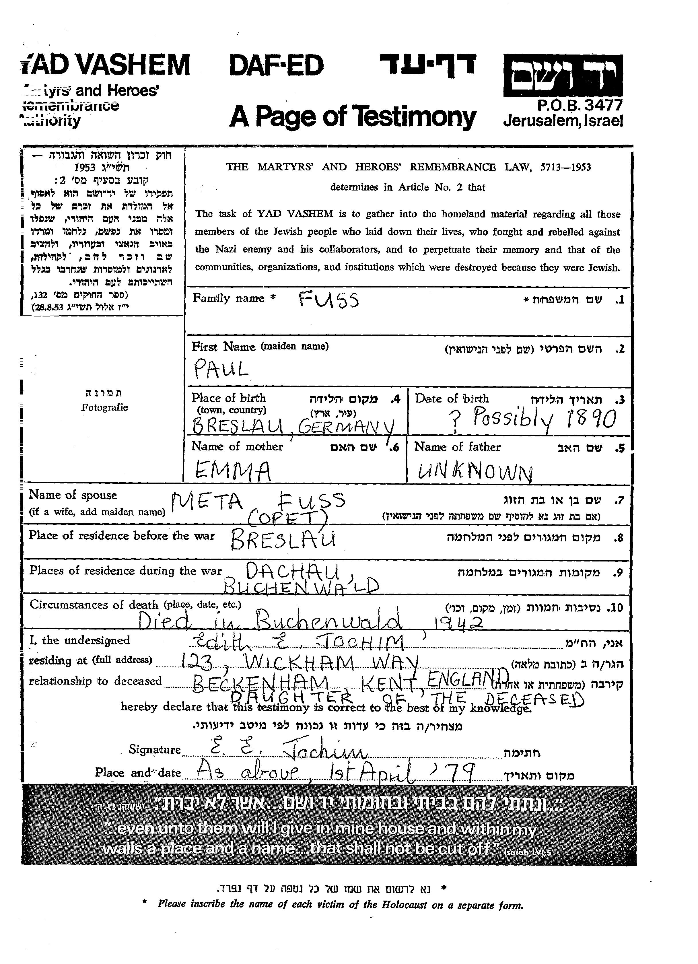 Paul Fuss est né à Breslau, Allemagne en 1890, fils de Emma. Il était Mariée à Meta née Opet. Avant la seconde guerre mondiale il vivait à Breslau, Allemagne. Au cours de la guerre, il était à Dachau, Allemagne.