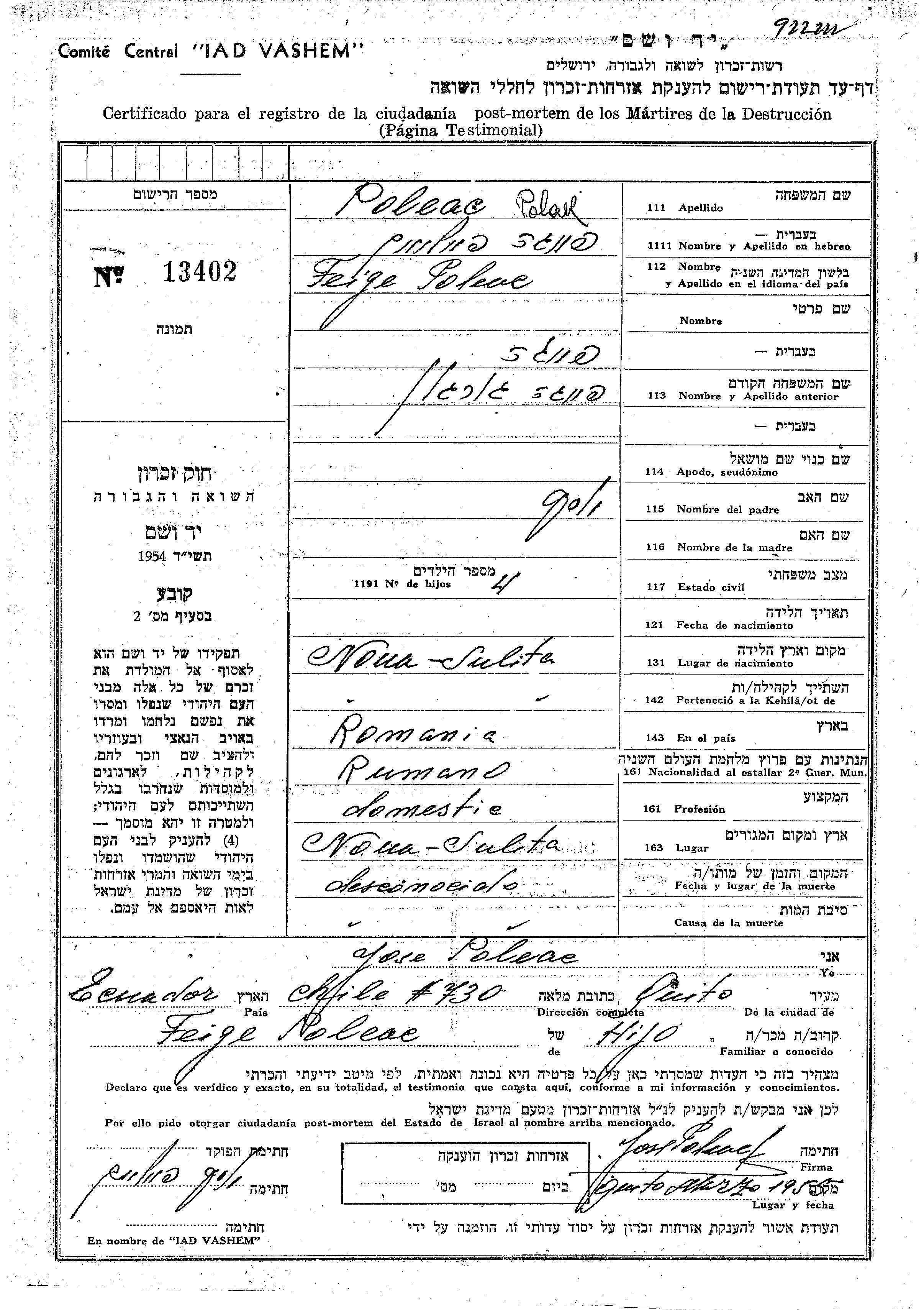 Poleac Feiga Novasulita, Roumanie Feuille de témoignage