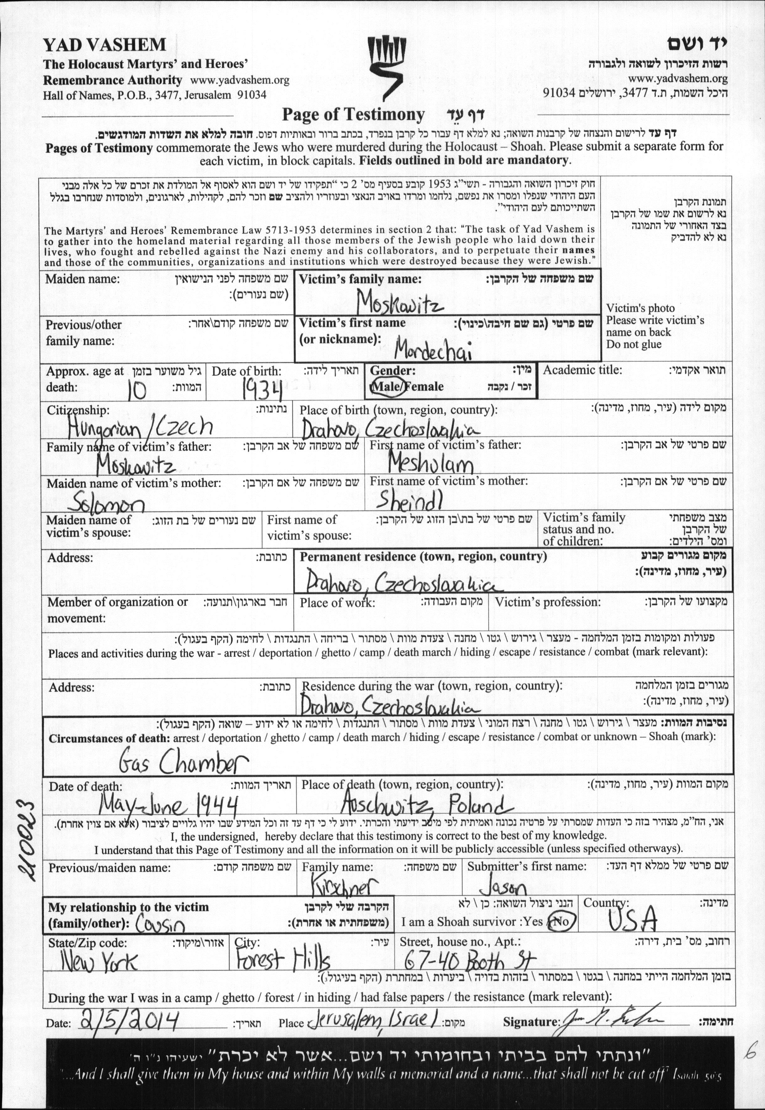 Moskowitz Mordechai 1934 Drahovo, Tchécoslovaquie Feuille de témoignage