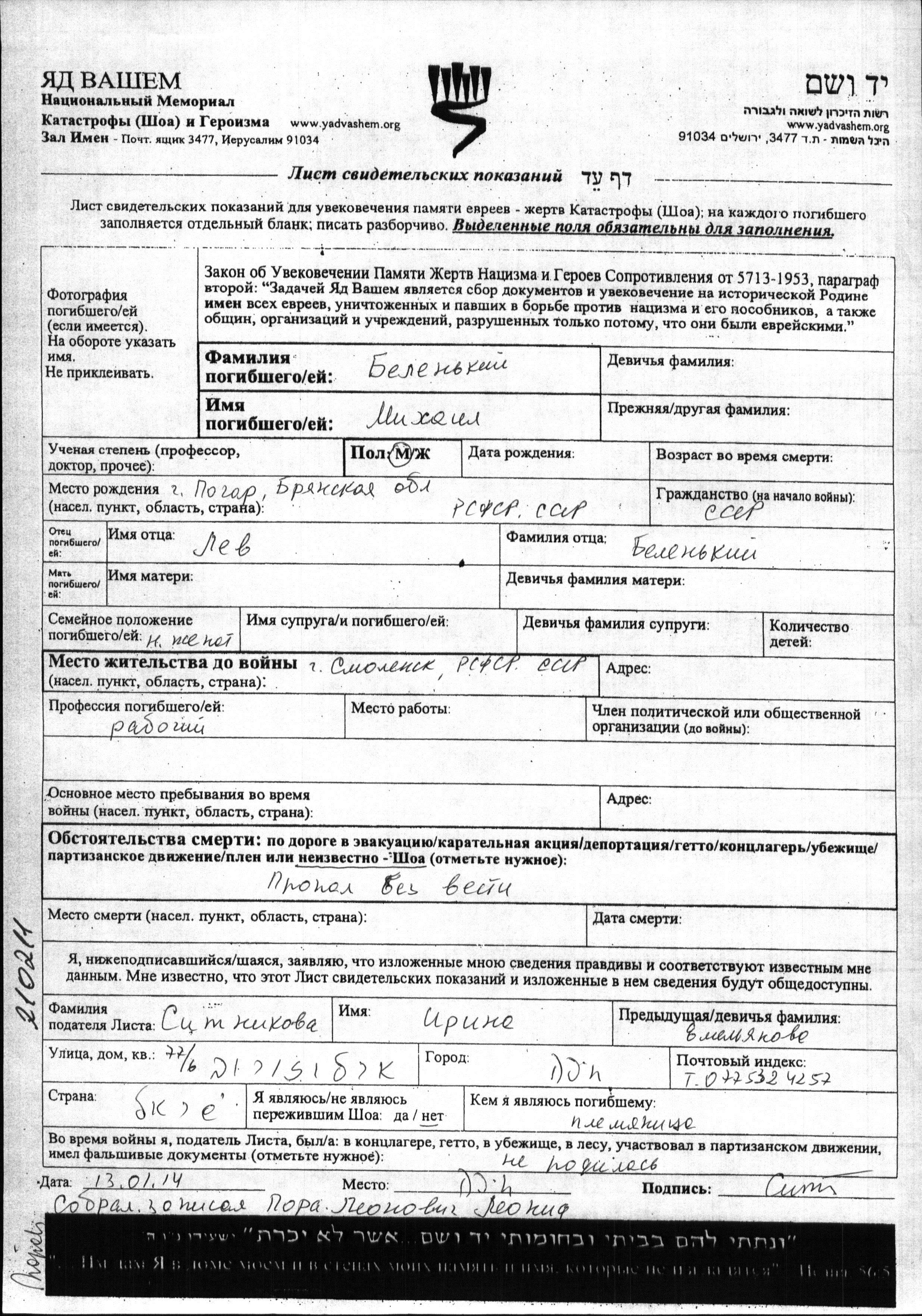 Belenkiy Mikhail Smolensk, Russie (URSS) Feuille de témoignage