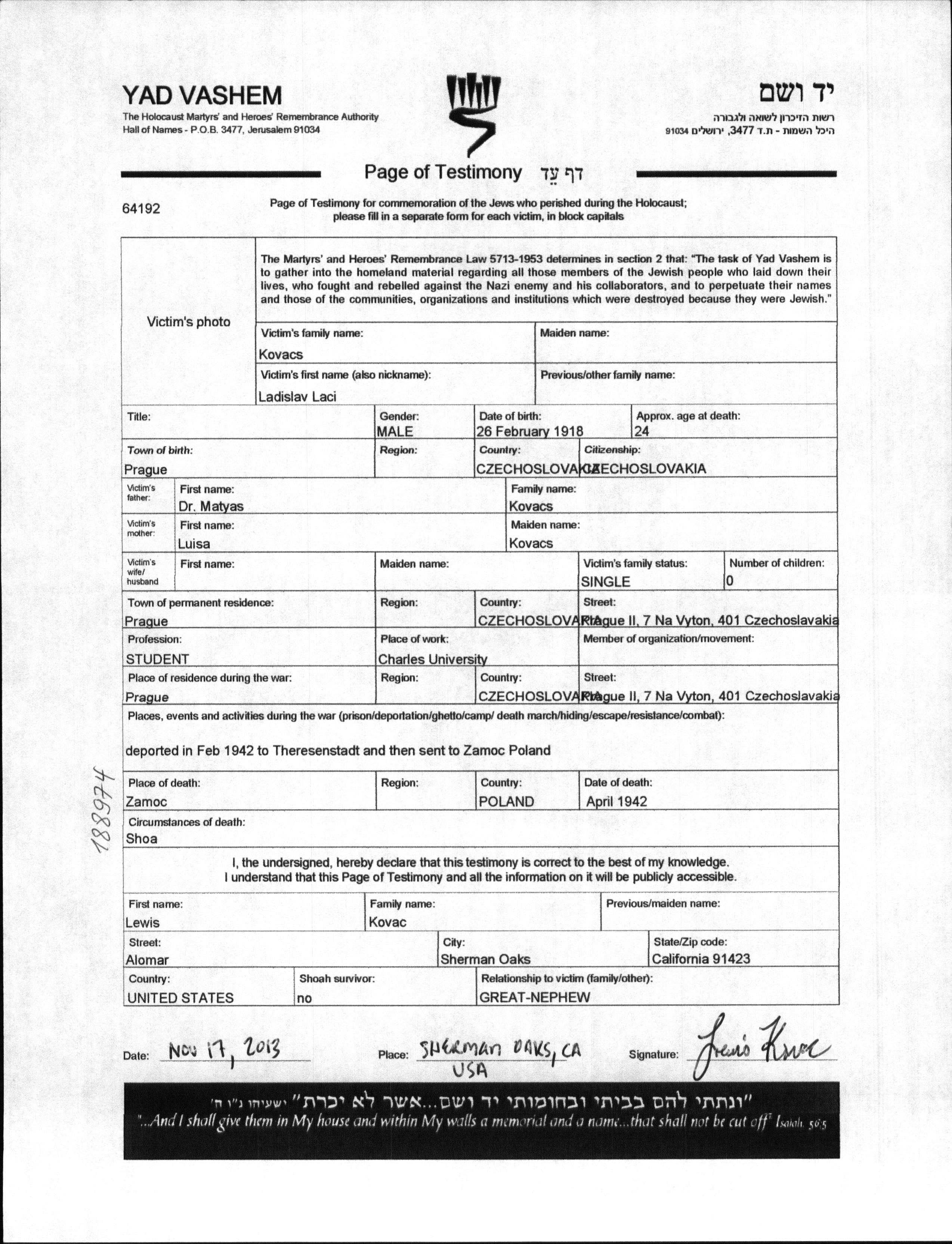 Ladislav Laci Kovacs est né à Praha, Tchécoslovaquie en 1918, fils de Matyas et de Luisa. Il était Étudiant/e et Célibataire. Avant la seconde guerre mondiale il vivait à Praha, Tchécoslovaquie. Au cours de la guerre, il était à Theresienstadt, Tchécoslovaquie.
