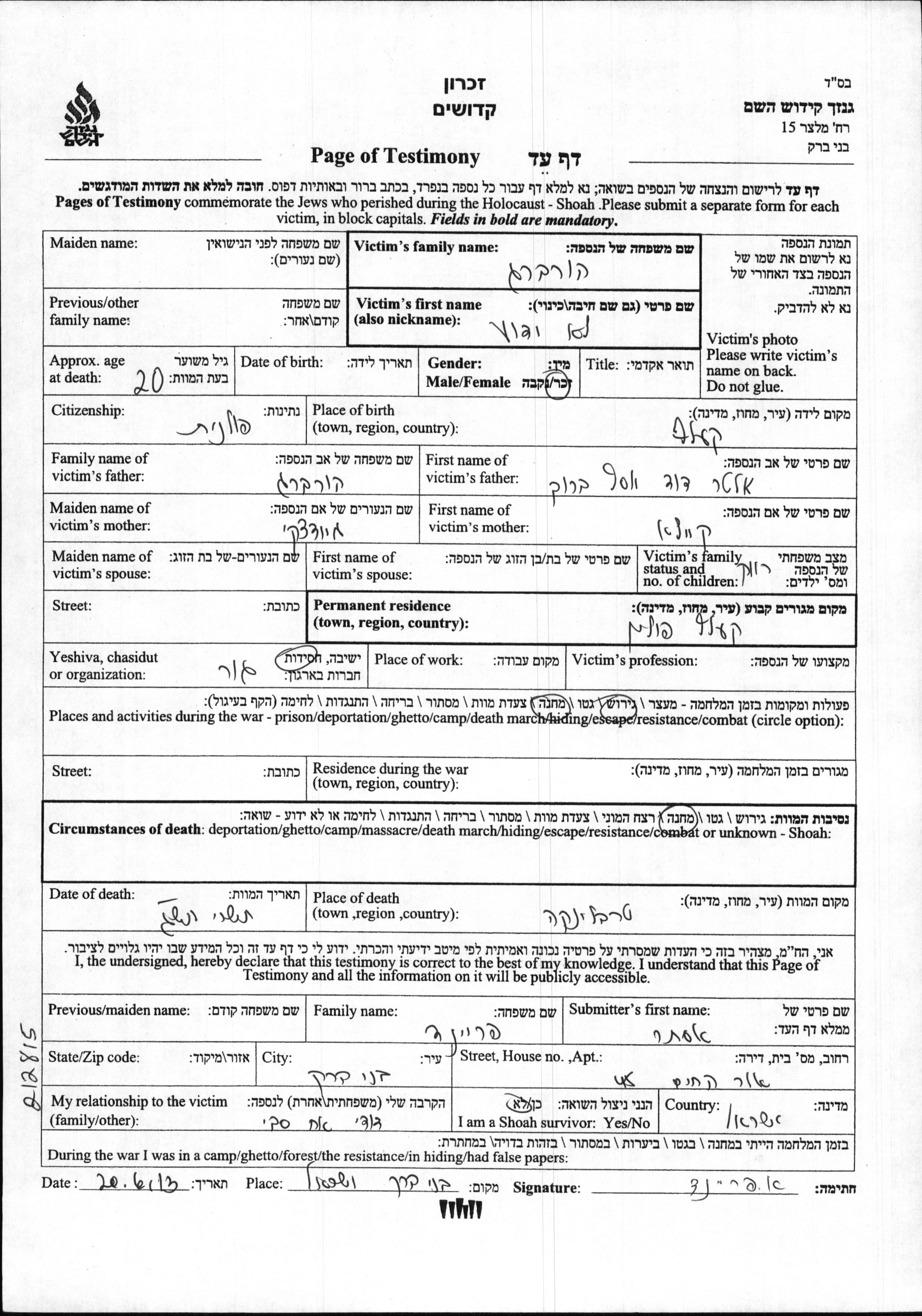 Yad Vashem - Pages of Testimony Names Memorial Collection