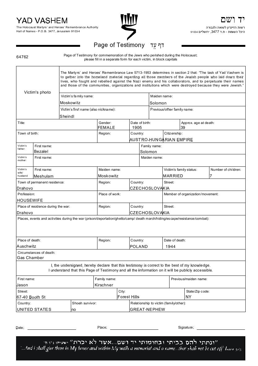 Moskowitz Sheindl 1905 Drahovo, Tchécoslovaquie Feuille de témoignage (digitale)
