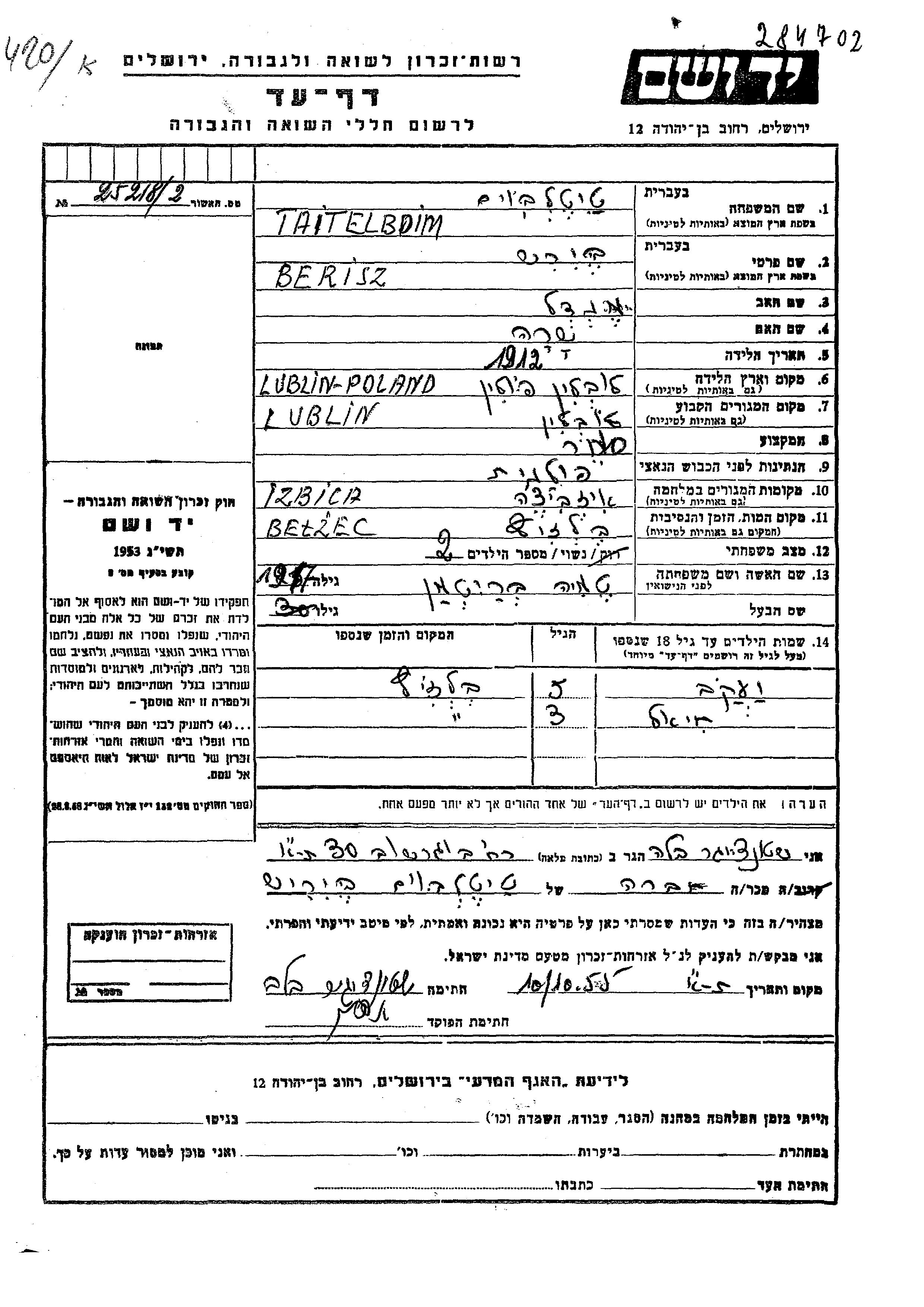 Taitelboim Berisz 1912 Lublin, Pologne Feuille de témoignage
