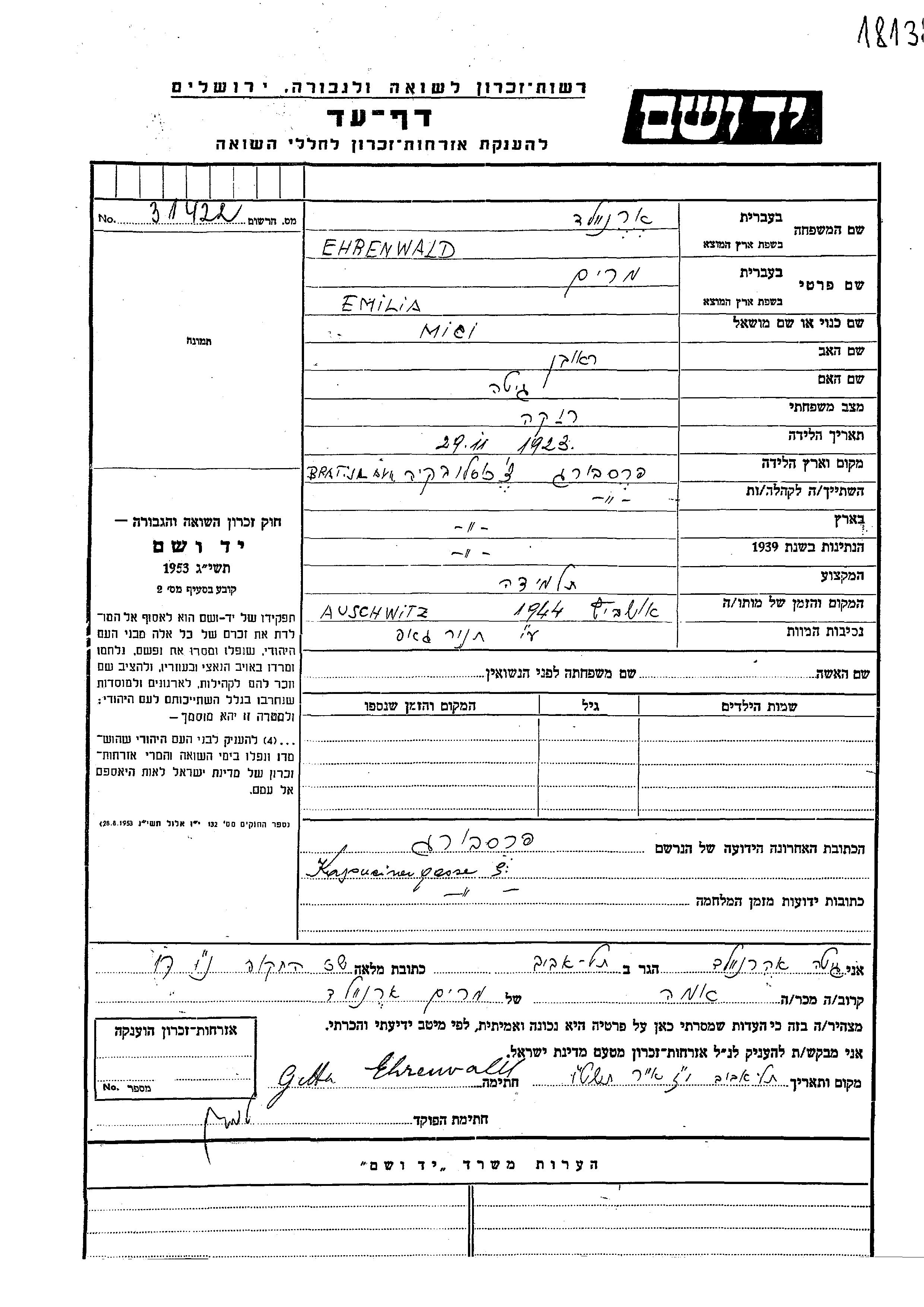 Ehrenwald Emilia Mici 1923 Bratislava, Tchécoslovaquie Feuille de témoignage