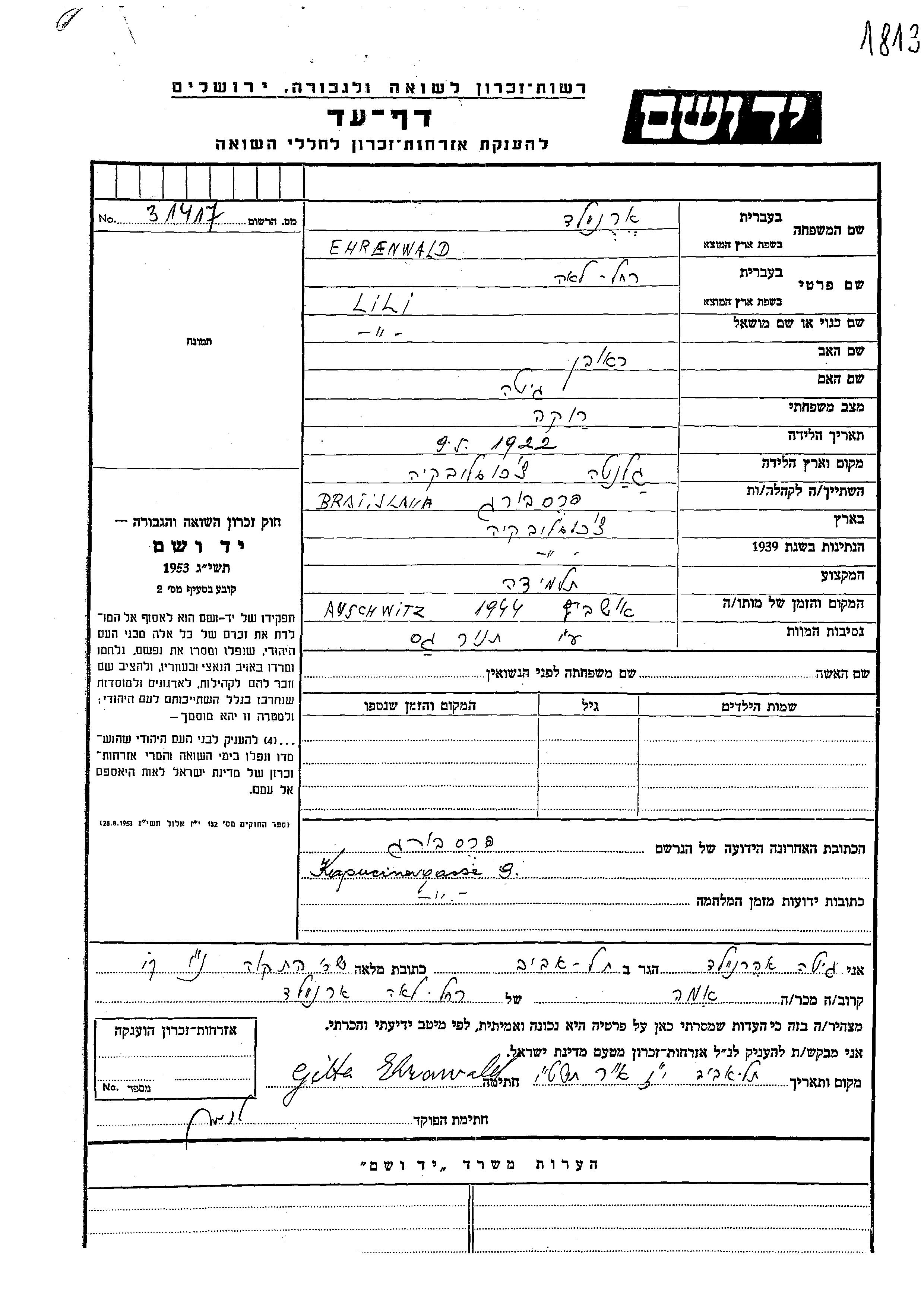 Ehrenwald Arnold Lili Rakhel Lea 1922 Bratislava, Tchécoslovaquie Feuille de témoignage