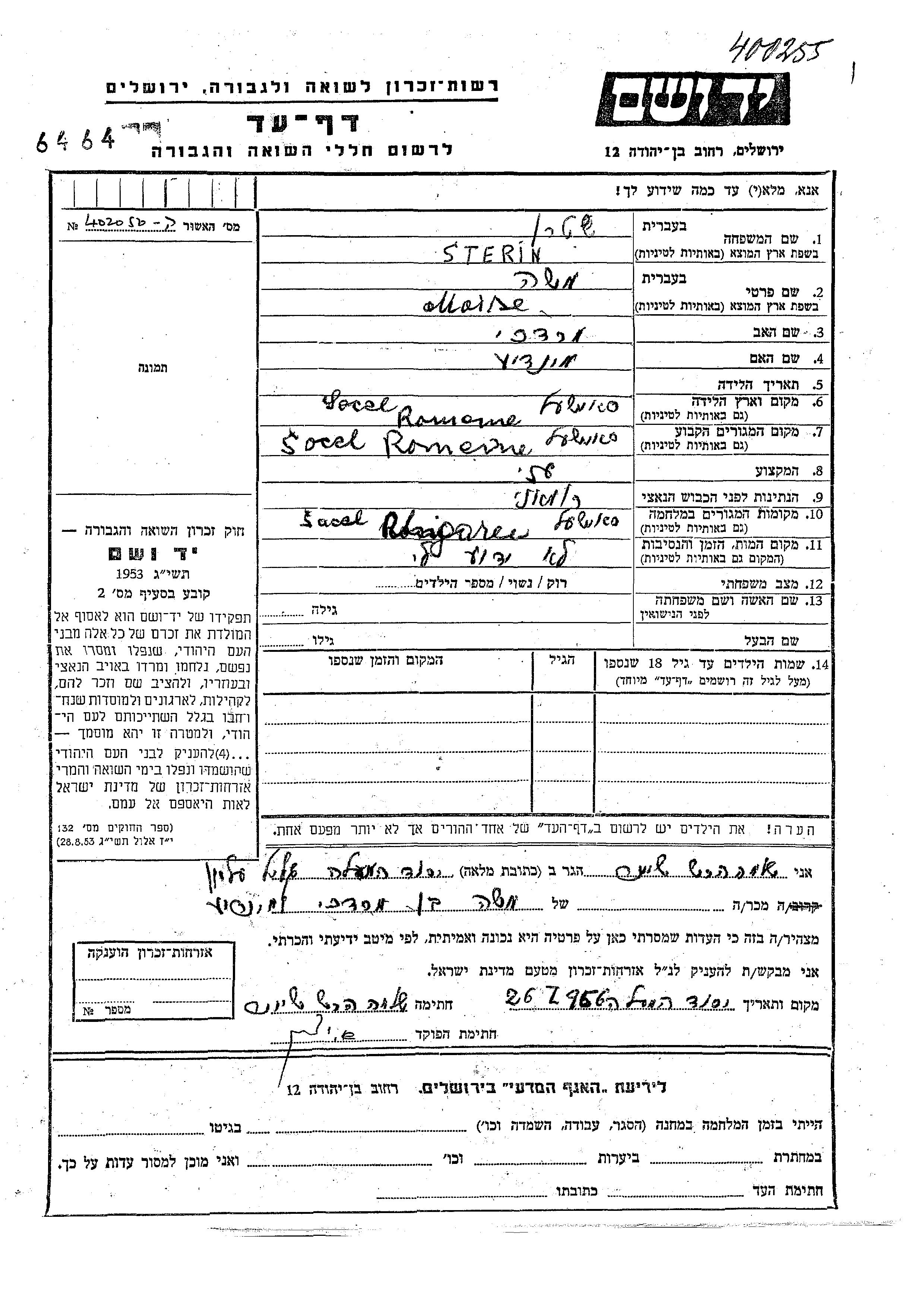 Sterin Shtern Moise Sacel, Roumanie Feuille de témoignage