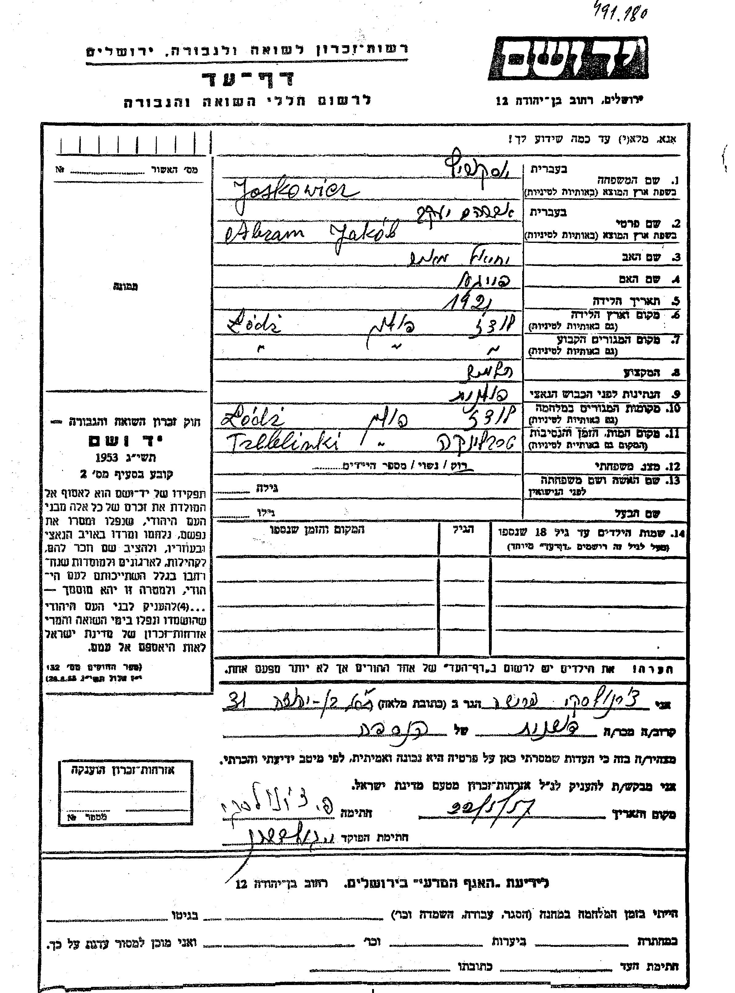 Joskowicz Abram Yakob 1921 Lodz, Pologne Feuille de témoignage