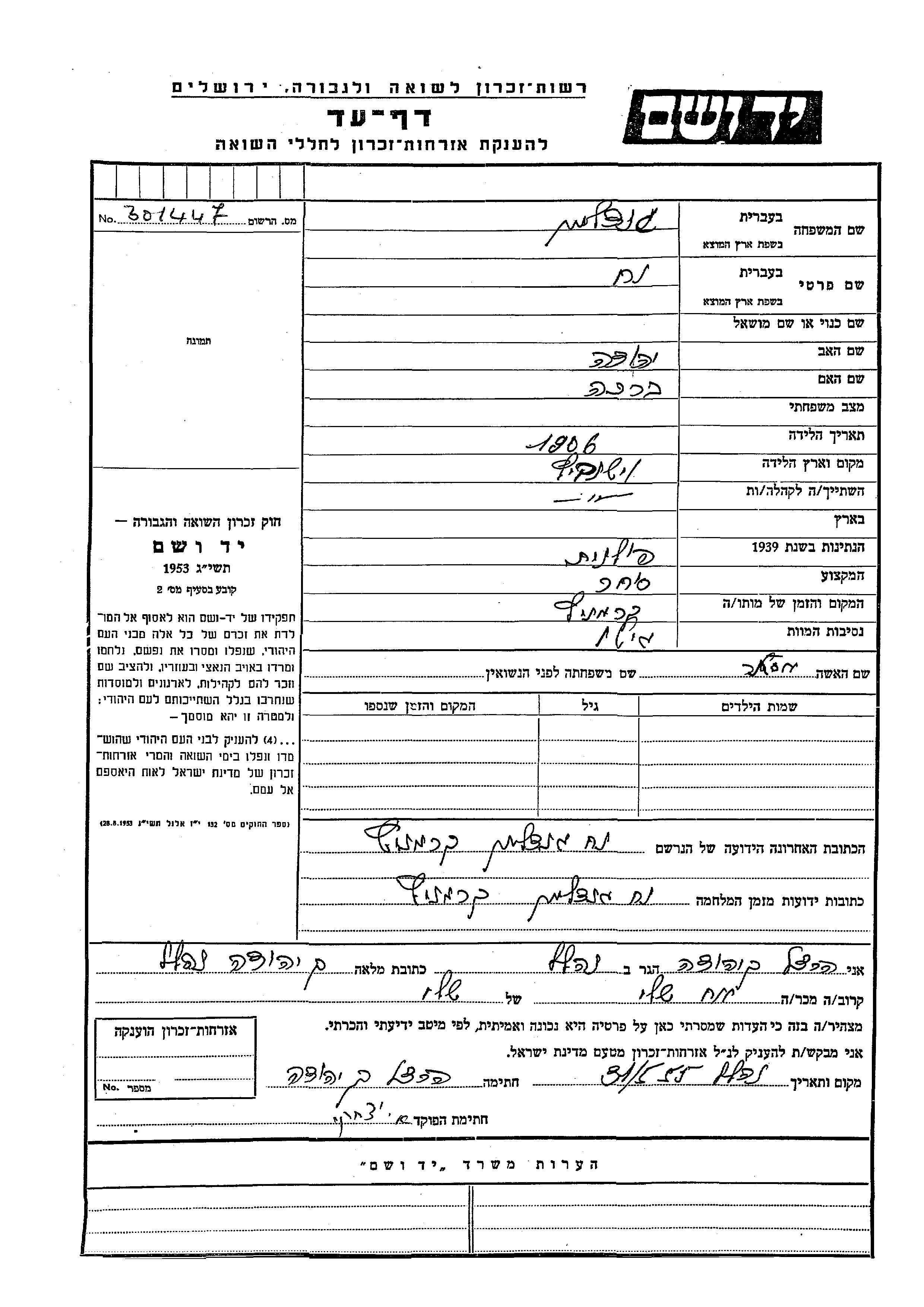 Yad Vashem - Pages of Testimony Names Memorial Collection