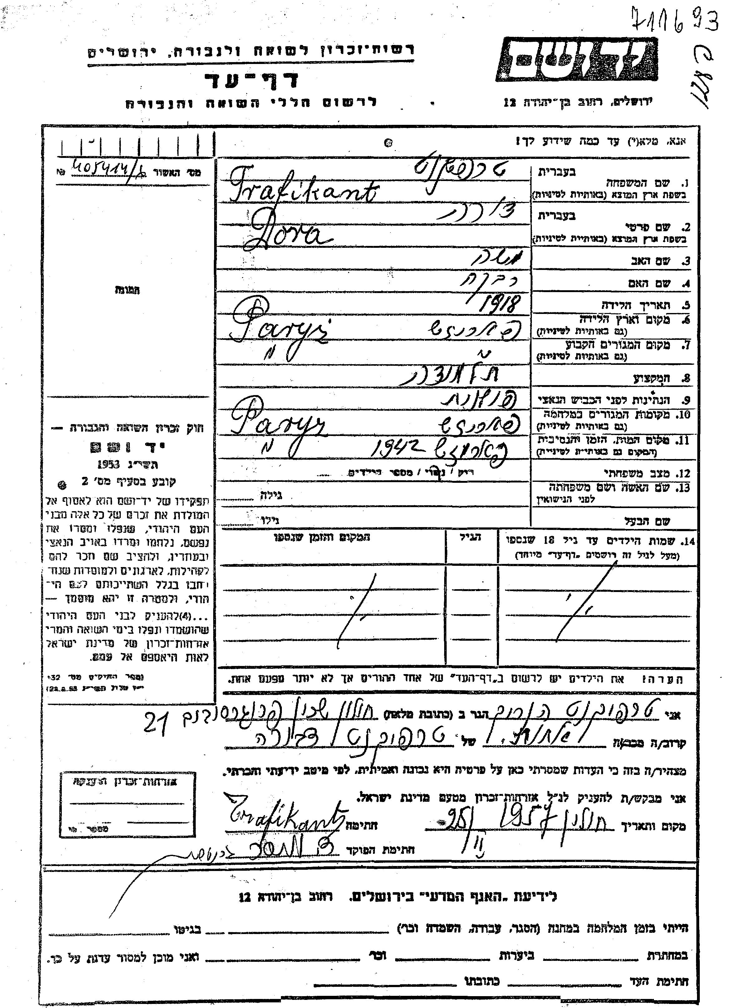 Dora Trafikant est née à Paryz, France en 1918, fille de Moshe et de Rivka. Elle était Élève et Célibataire. Avant la seconde guerre mondiale elle vivait à Paryz, France. Pendant la guerre, elle était à Paryz, France.