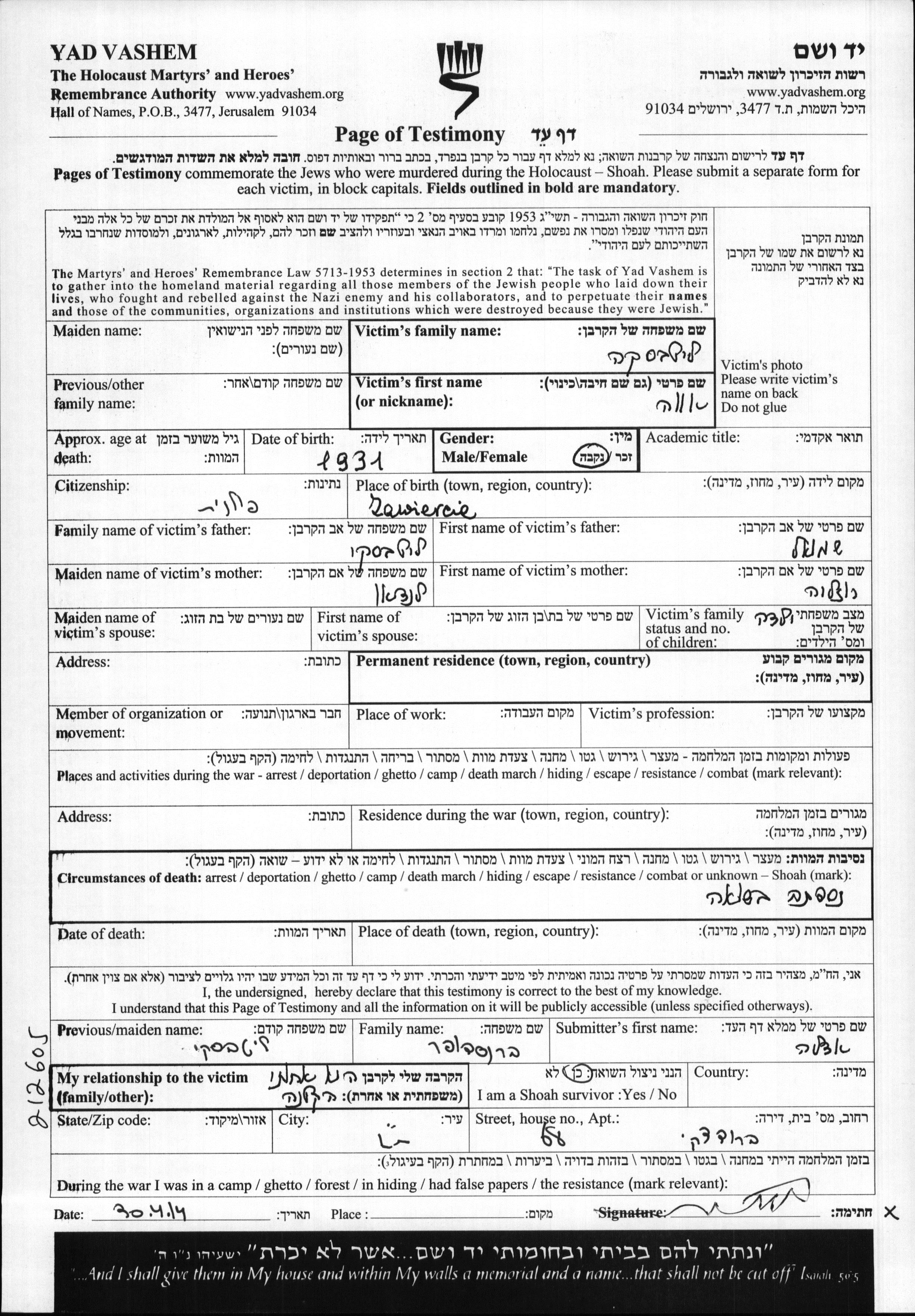 Yad Vashem - Pages of Testimony Names Memorial Collection