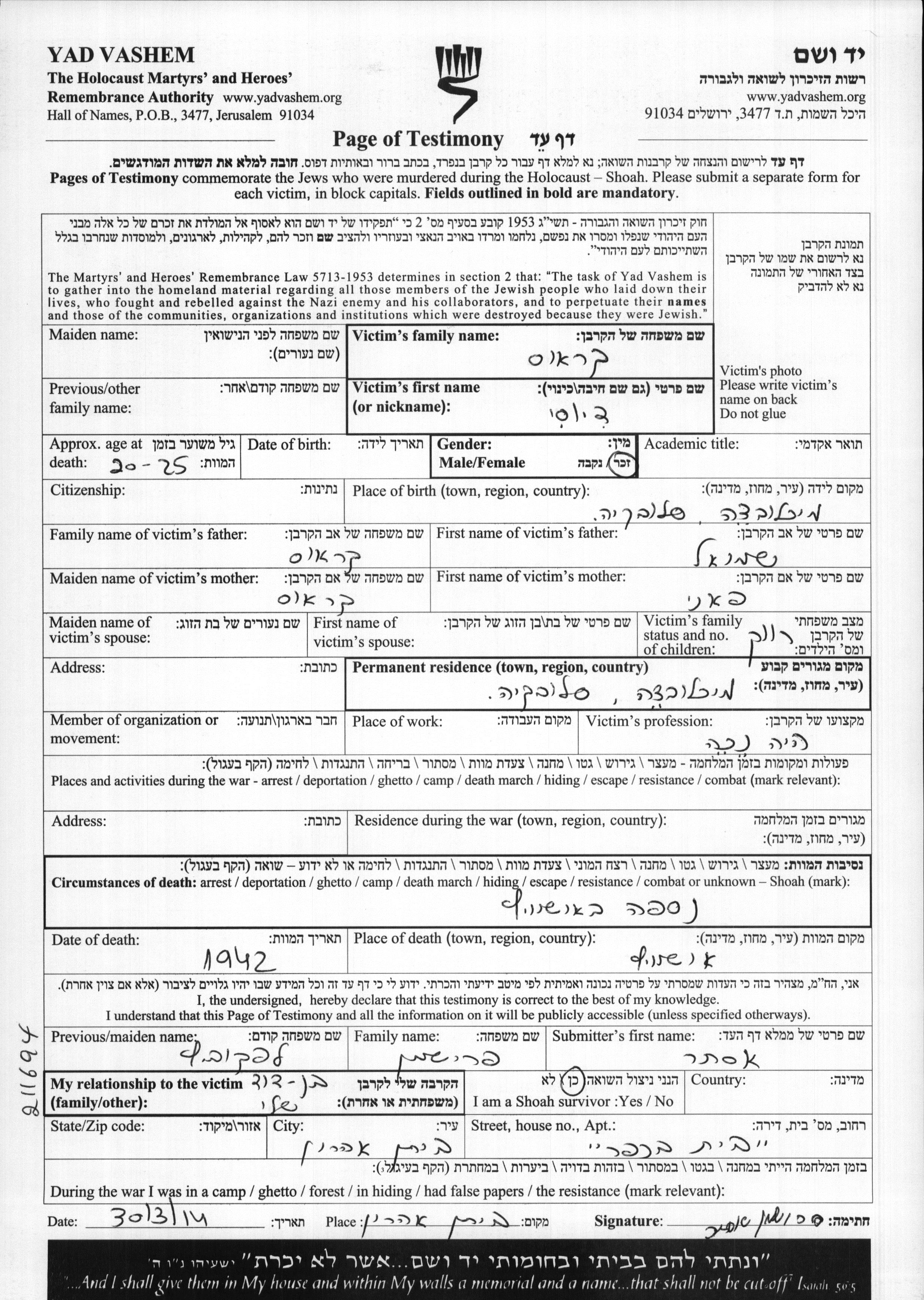 Yad Vashem - Pages of Testimony Names Memorial Collection
